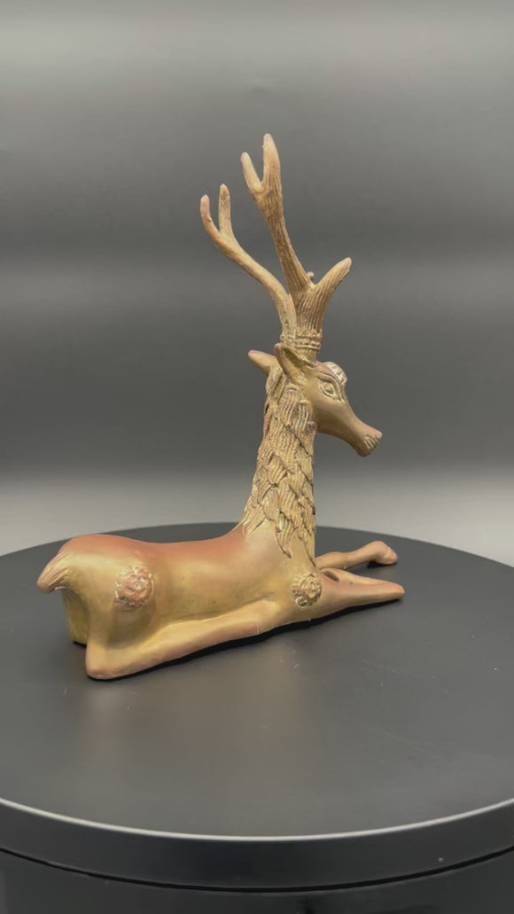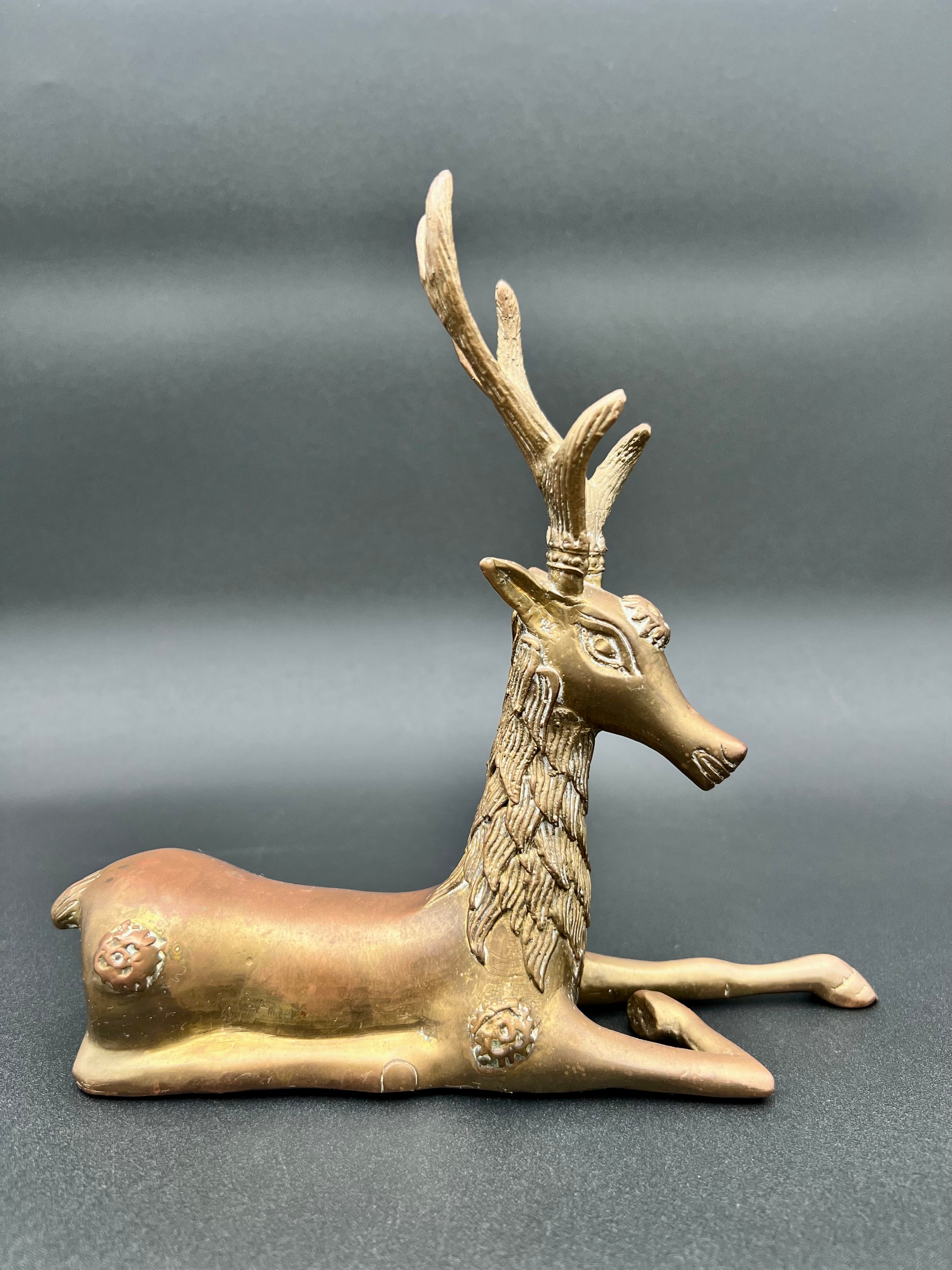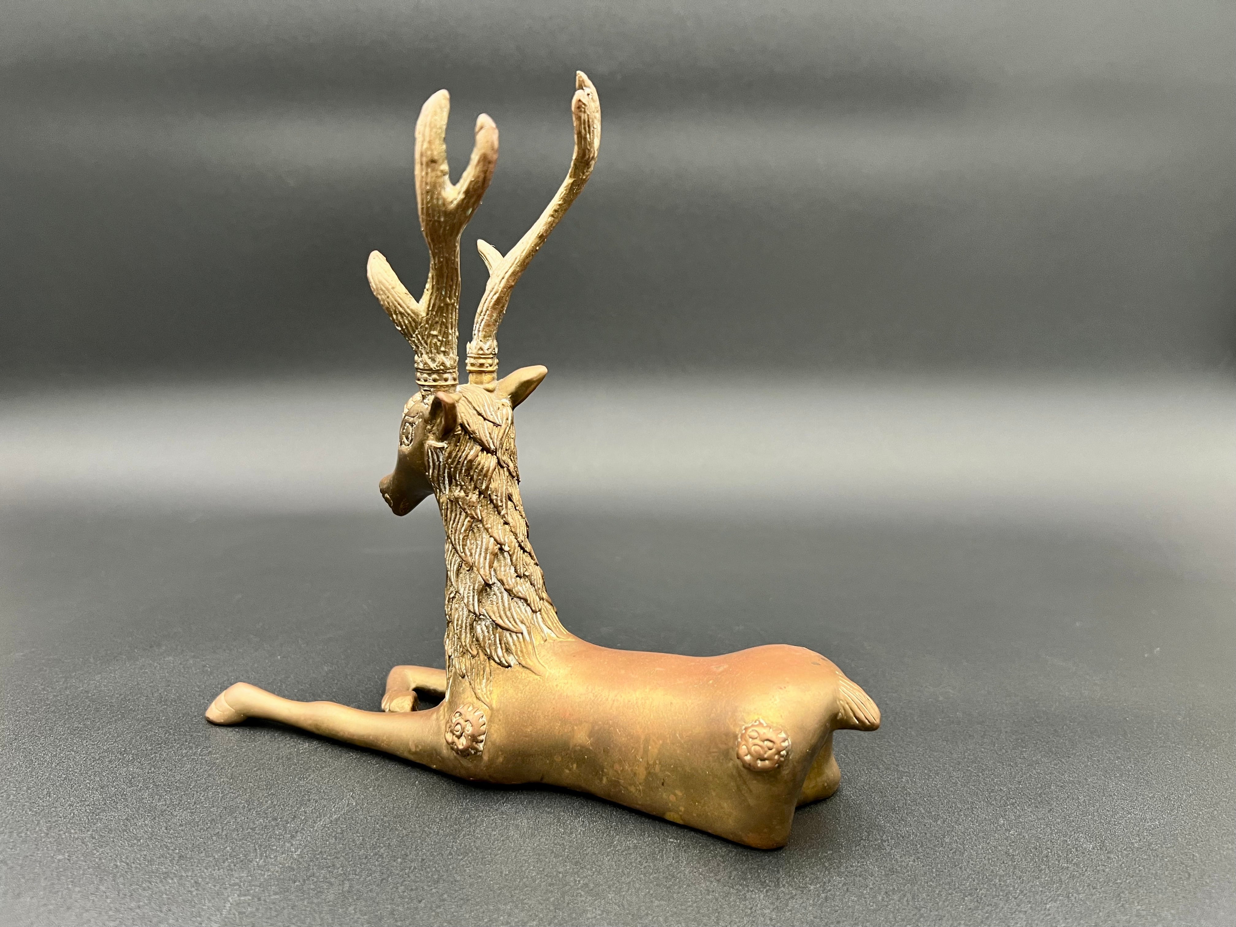 Evoking quiet elegance and timeless charm, this solid brass sculpture captures a serene deer at rest. Handmade in Thailand, the piece reflects the intricate artistry and luxurious design language of the Hollywood Regency era. With its elongated limbs, finely detailed antlers, and soft golden patina, it radiates a sense of calm sophistication—equally at home on a mantel, bookshelf, or holiday table.