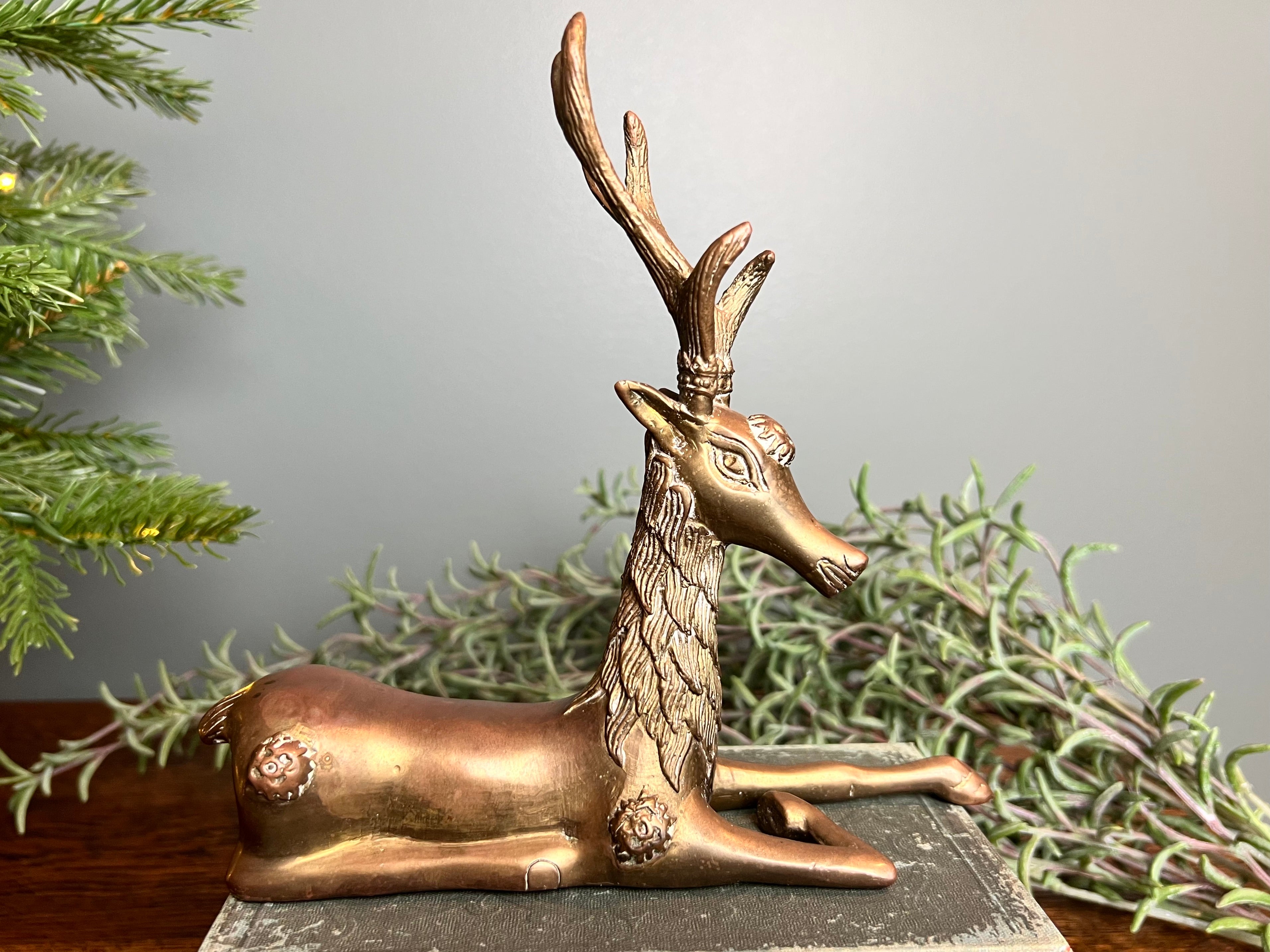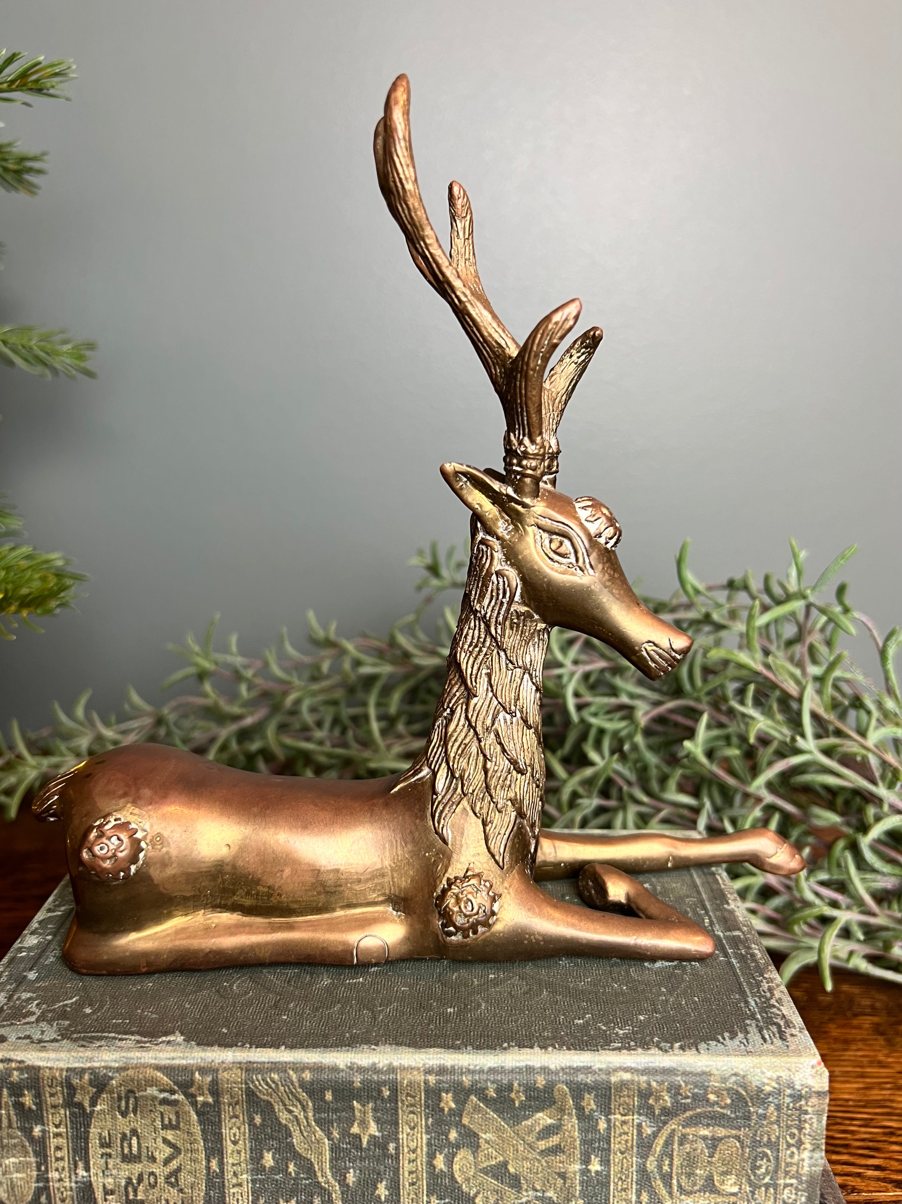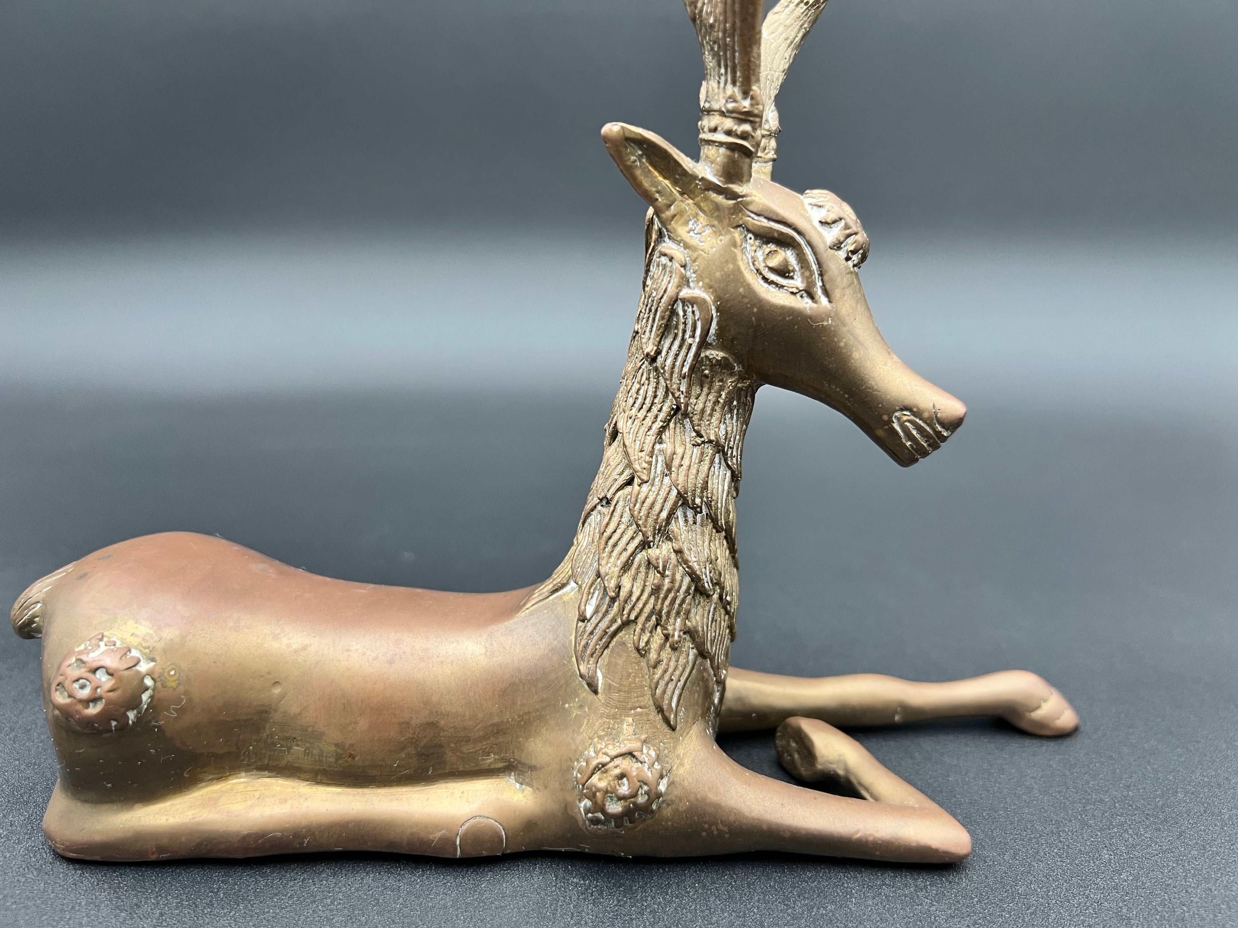 Evoking quiet elegance and timeless charm, this solid brass sculpture captures a serene deer at rest. Handmade in Thailand, the piece reflects the intricate artistry and luxurious design language of the Hollywood Regency era. With its elongated limbs, finely detailed antlers, and soft golden patina, it radiates a sense of calm sophistication—equally at home on a mantel, bookshelf, or holiday table.
