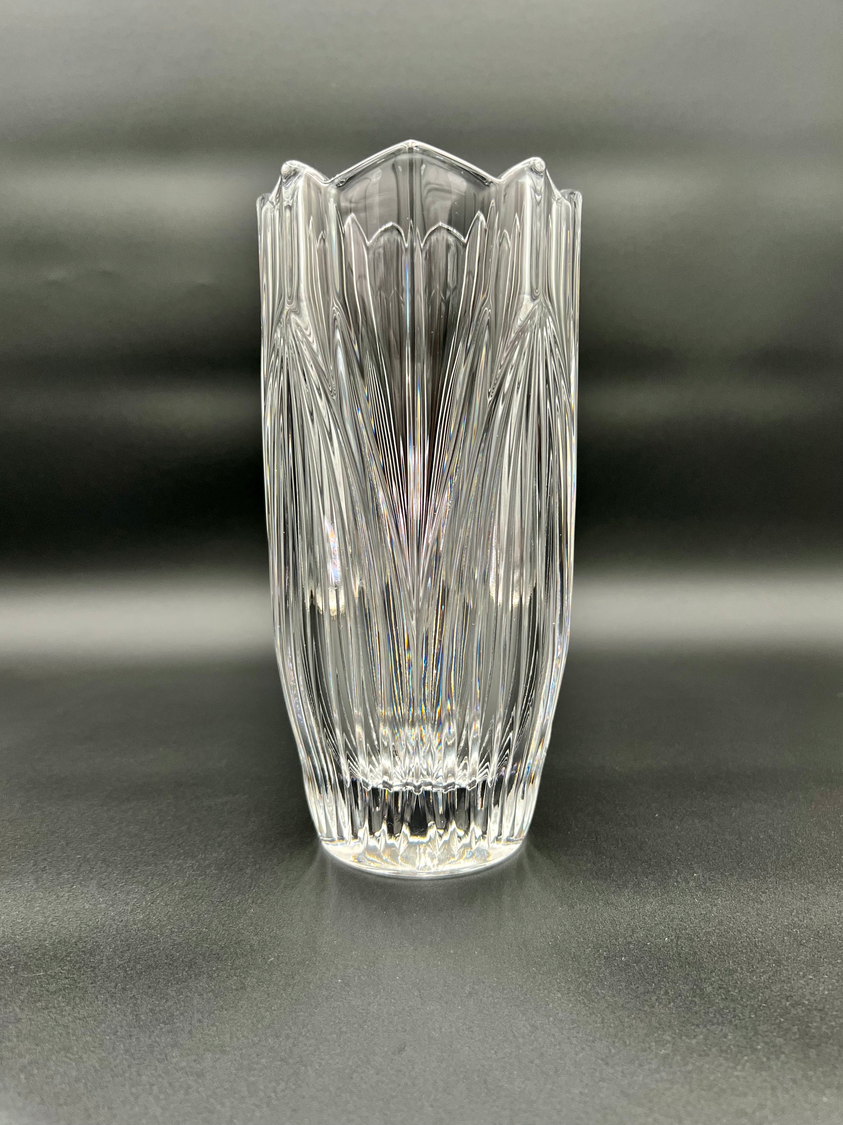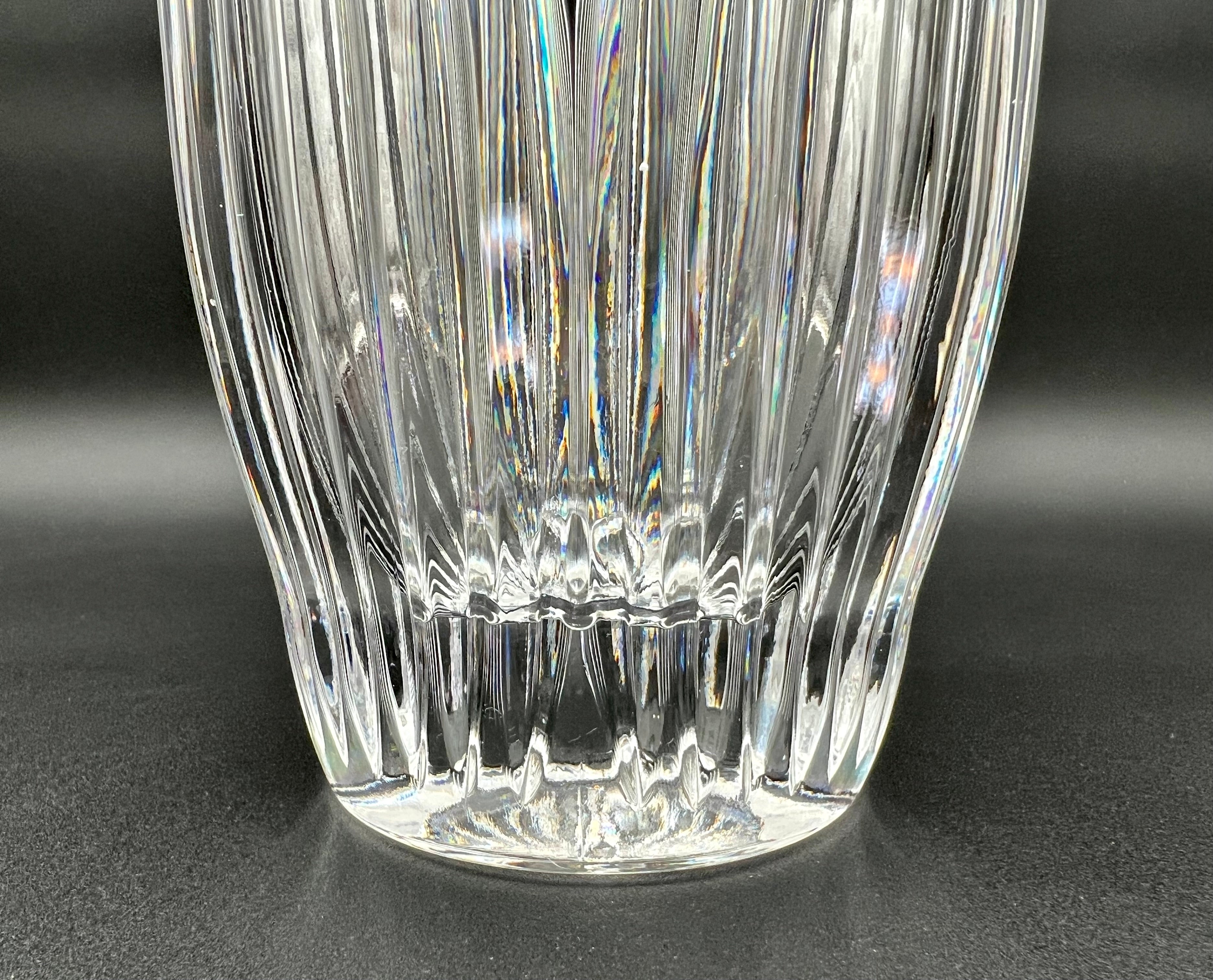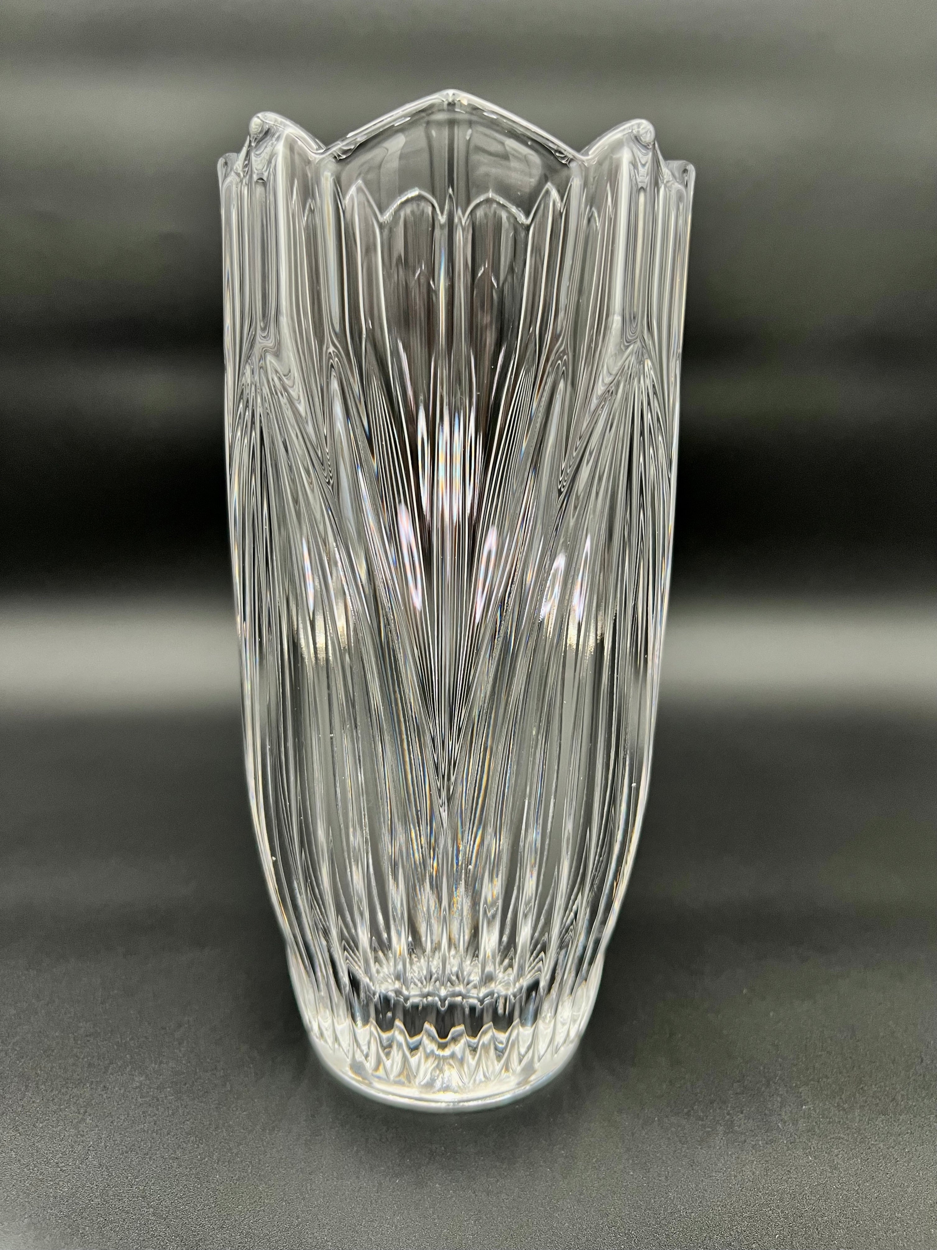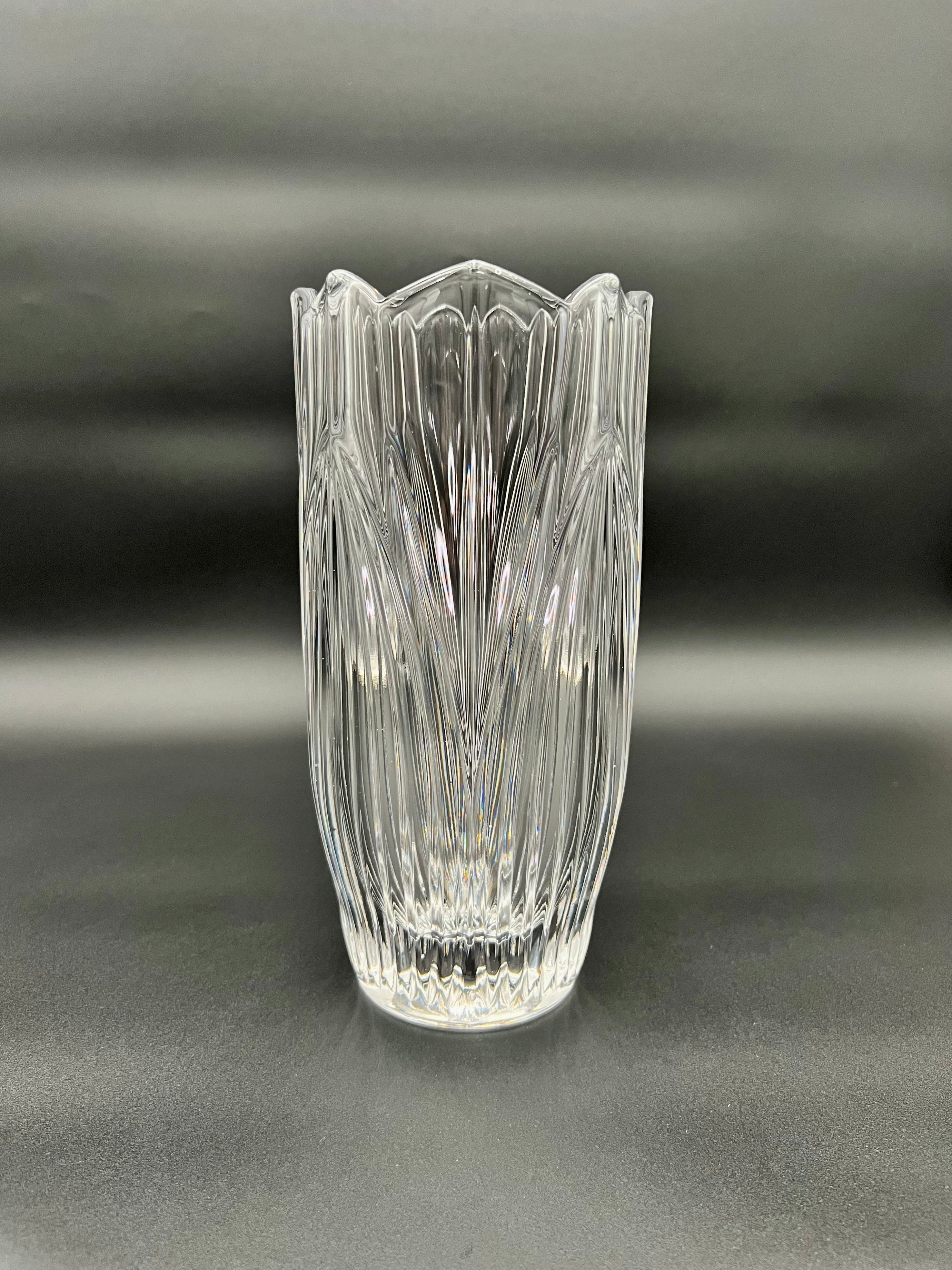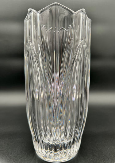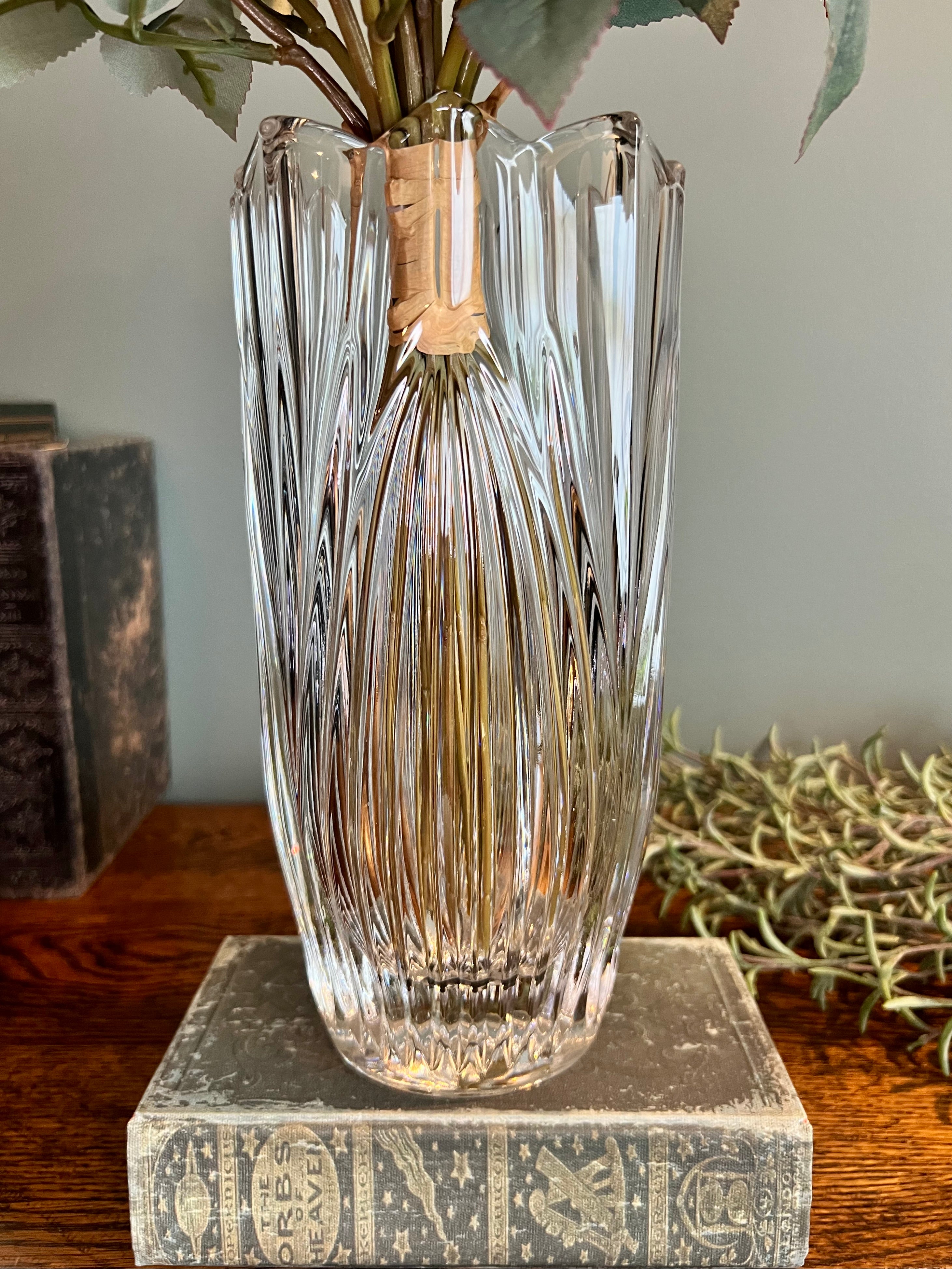 A vase that feels as though it was carved from light itself. This 24% lead crystal piece stands nearly ten inches tall, its fluted panels catching and bending reflections into prisms. Substantial in the hand and luminous in presence, it was crafted in the late 20th century, a period when heavy crystal was a mark of refinement and permanence in the home.