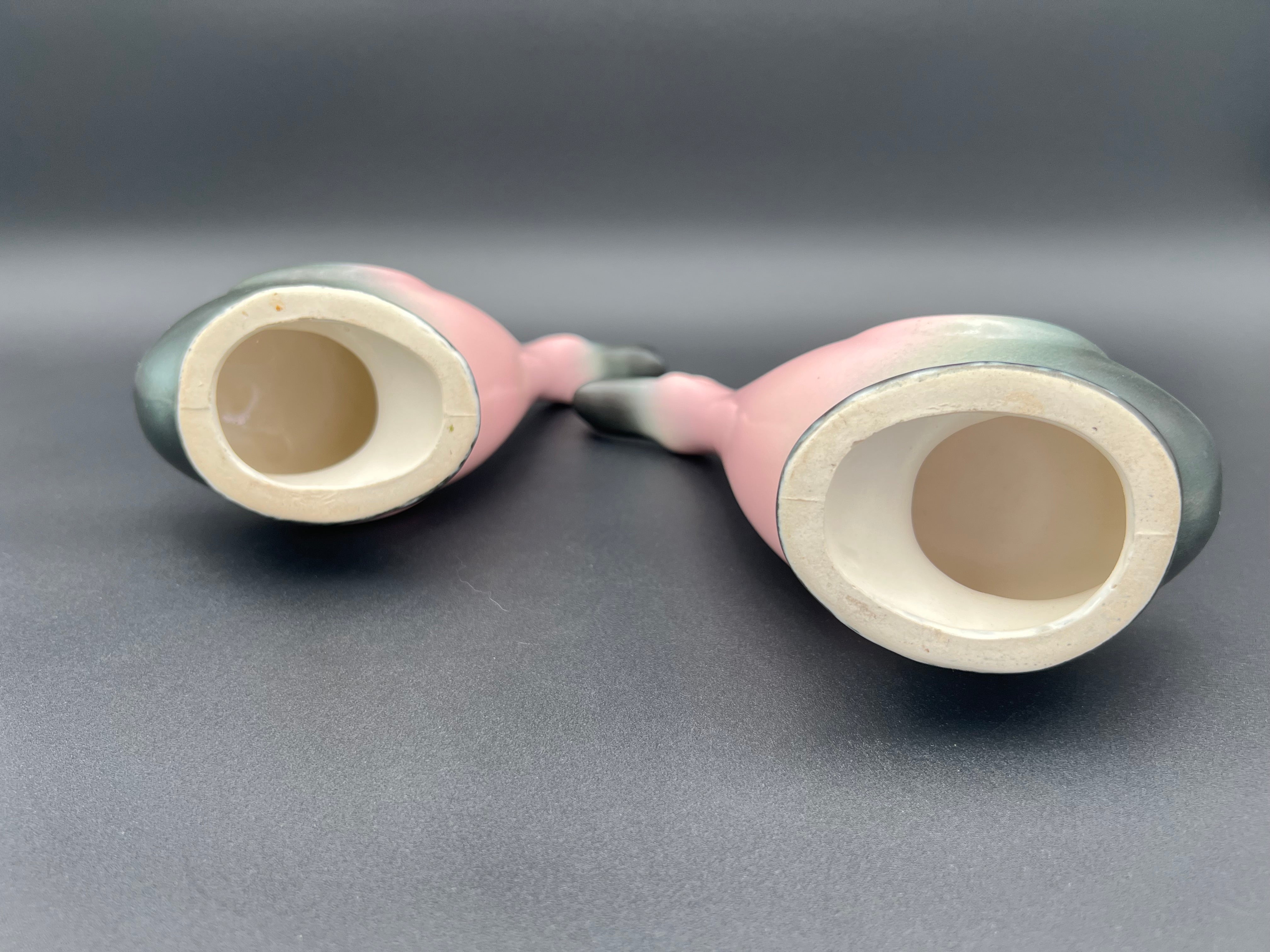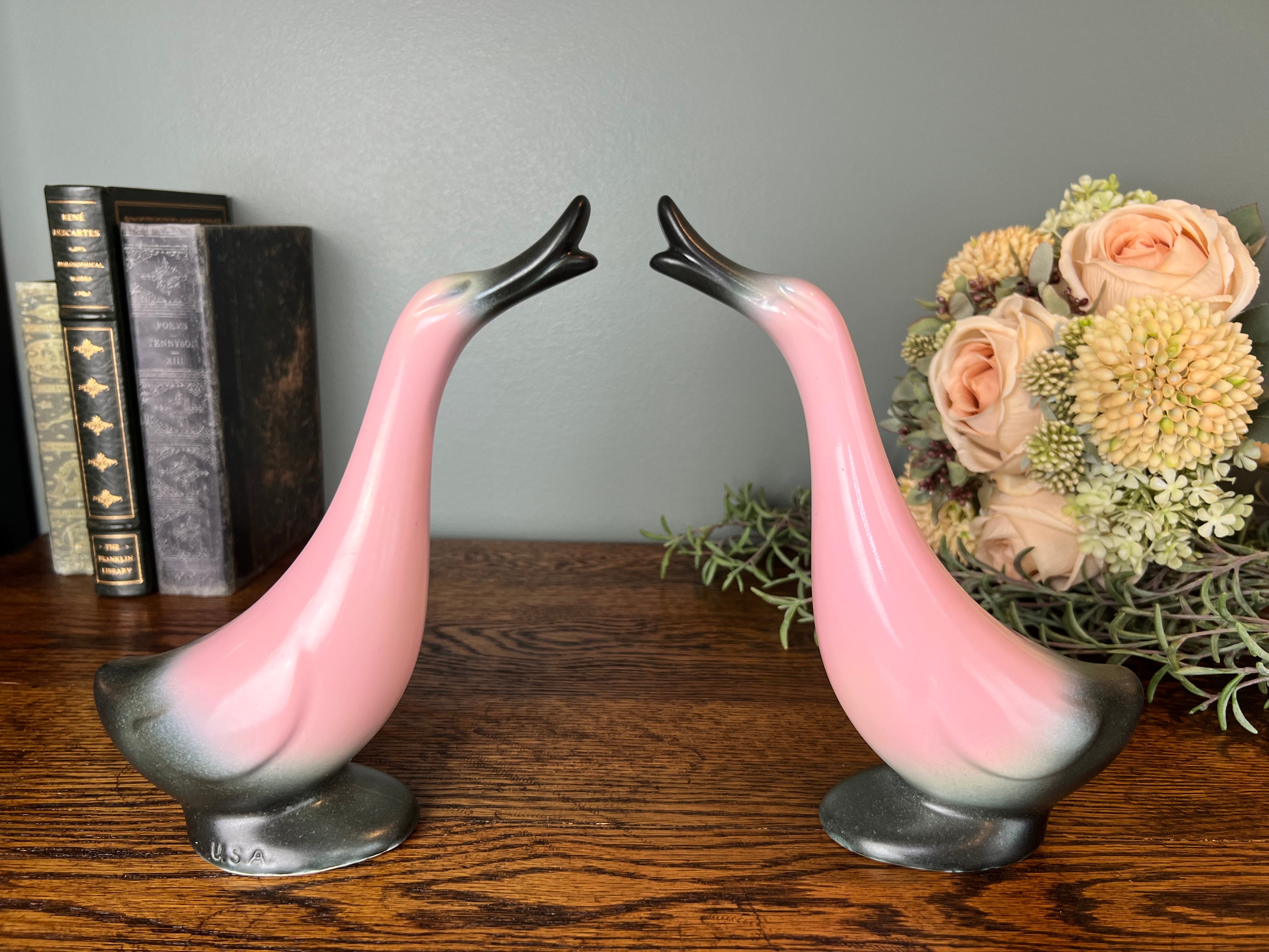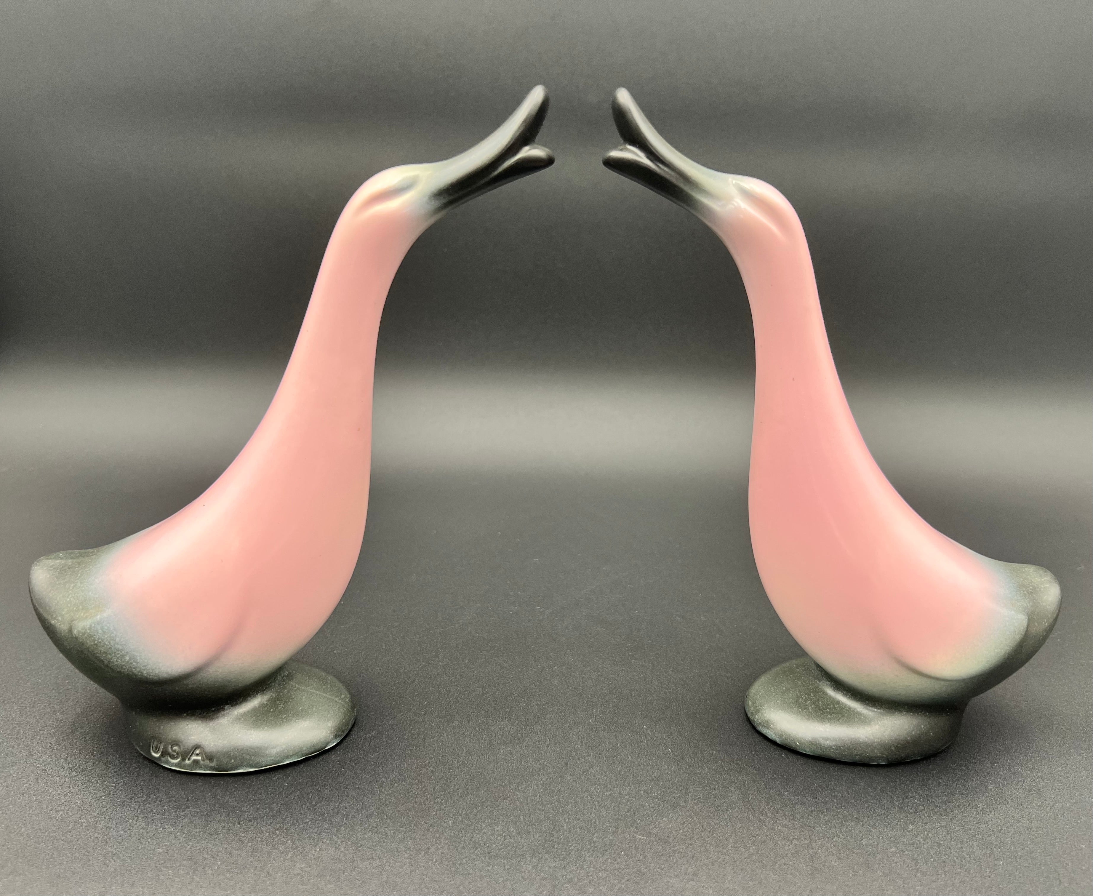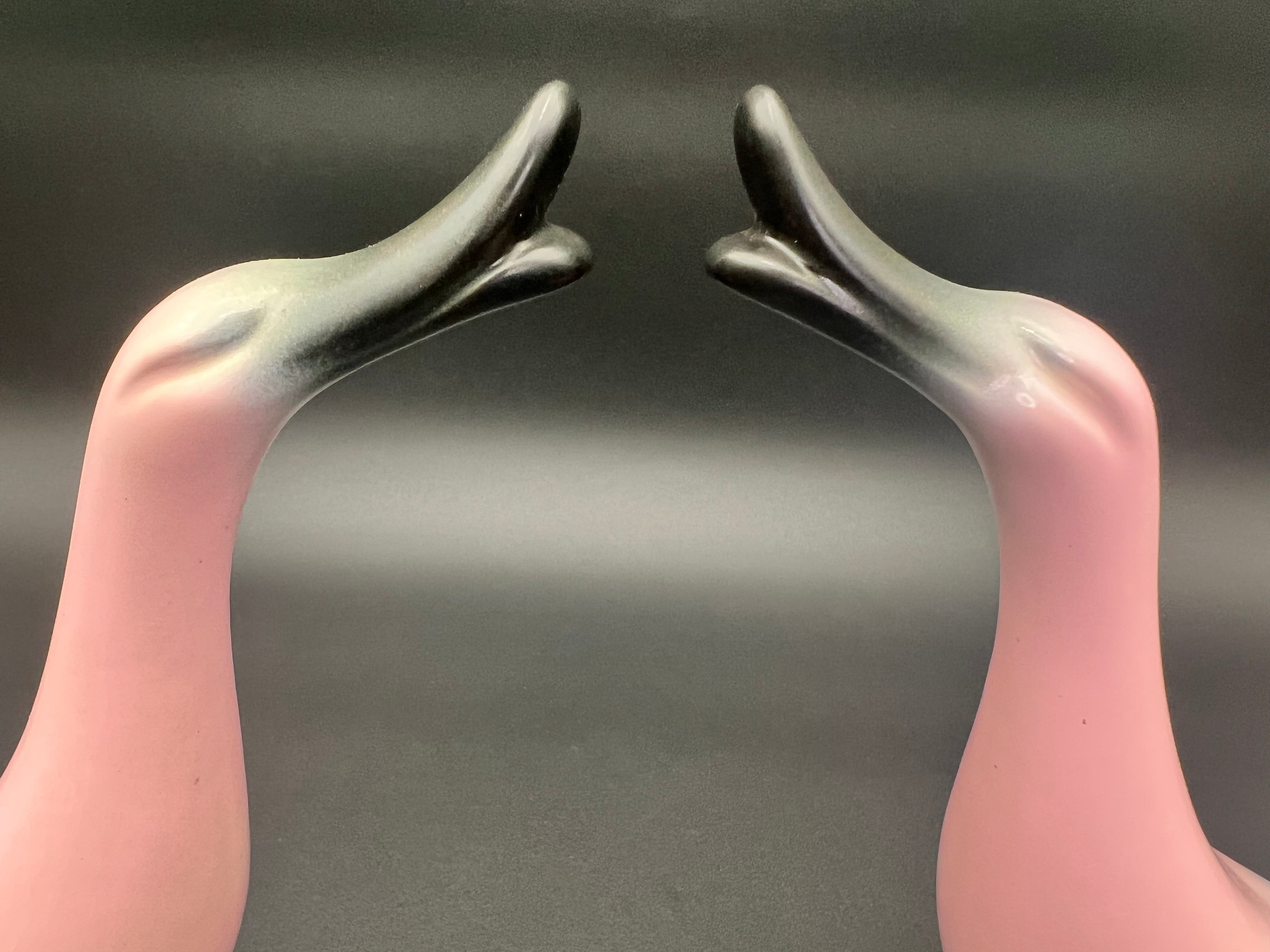 Their soft blush-pink bodies sweep upward into black-tipped beaks, the elongated necks poised in a timeless kiss. Each bird stands 8.75 inches tall, its silhouette as modern now as it was seventy years ago.