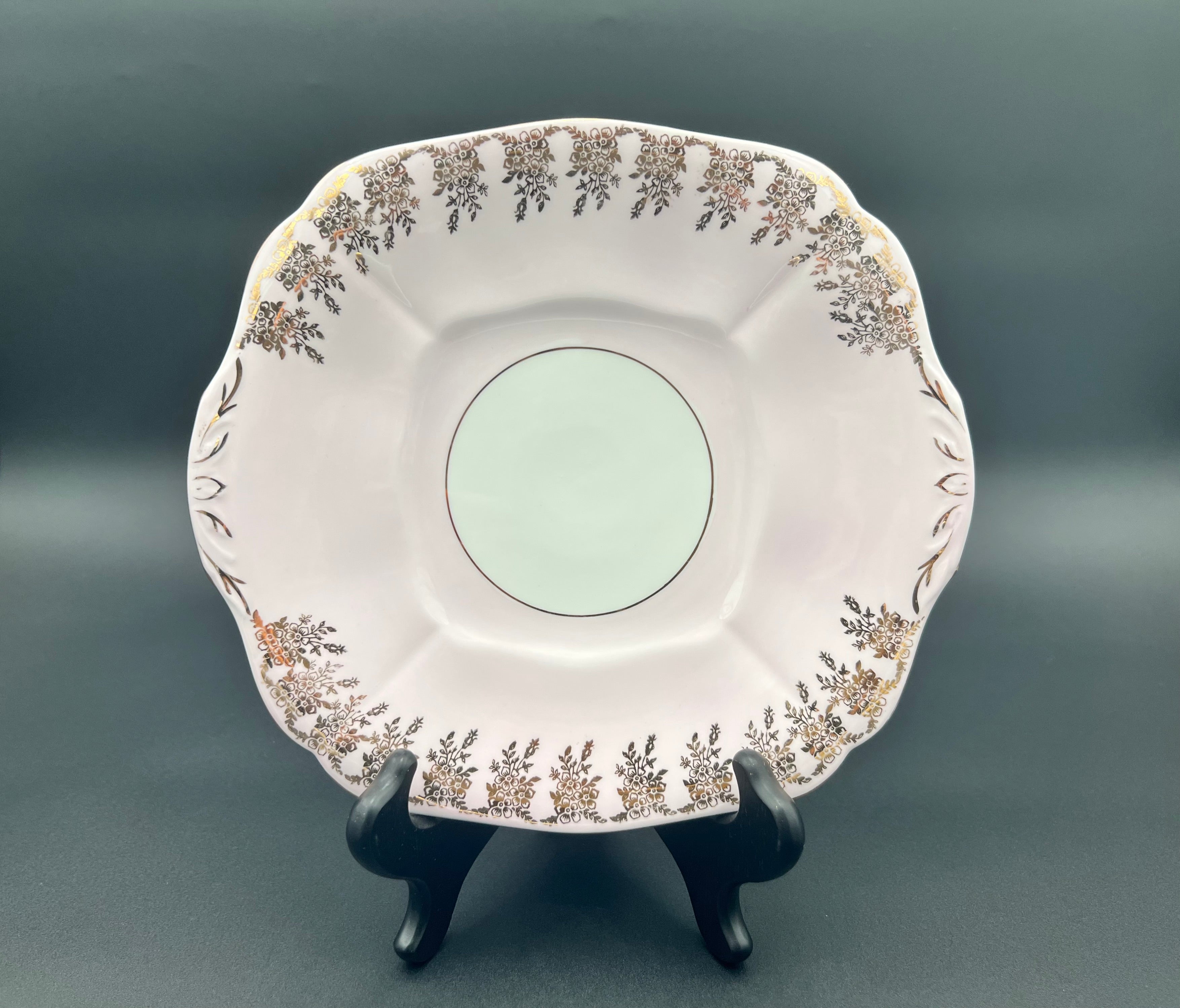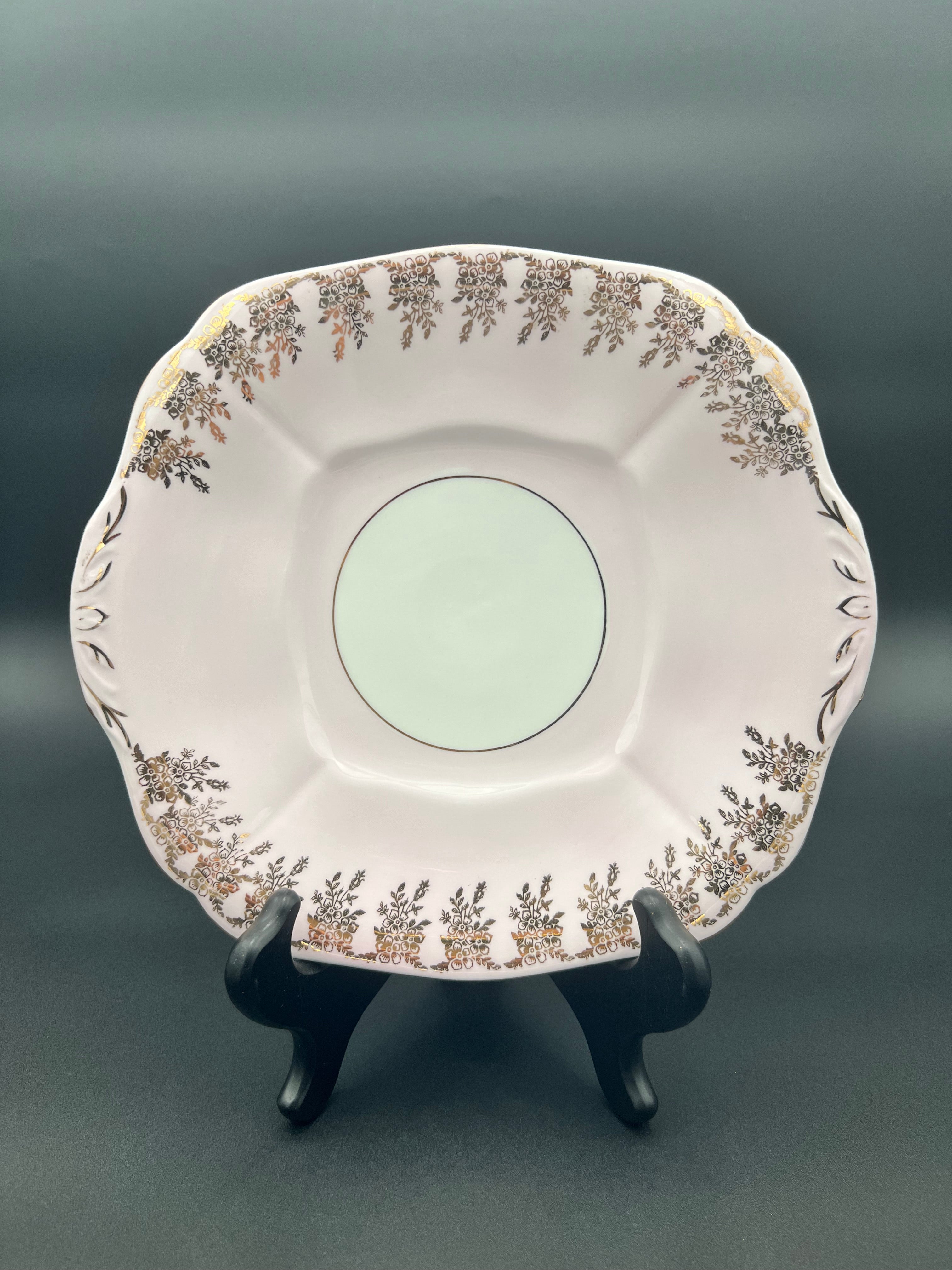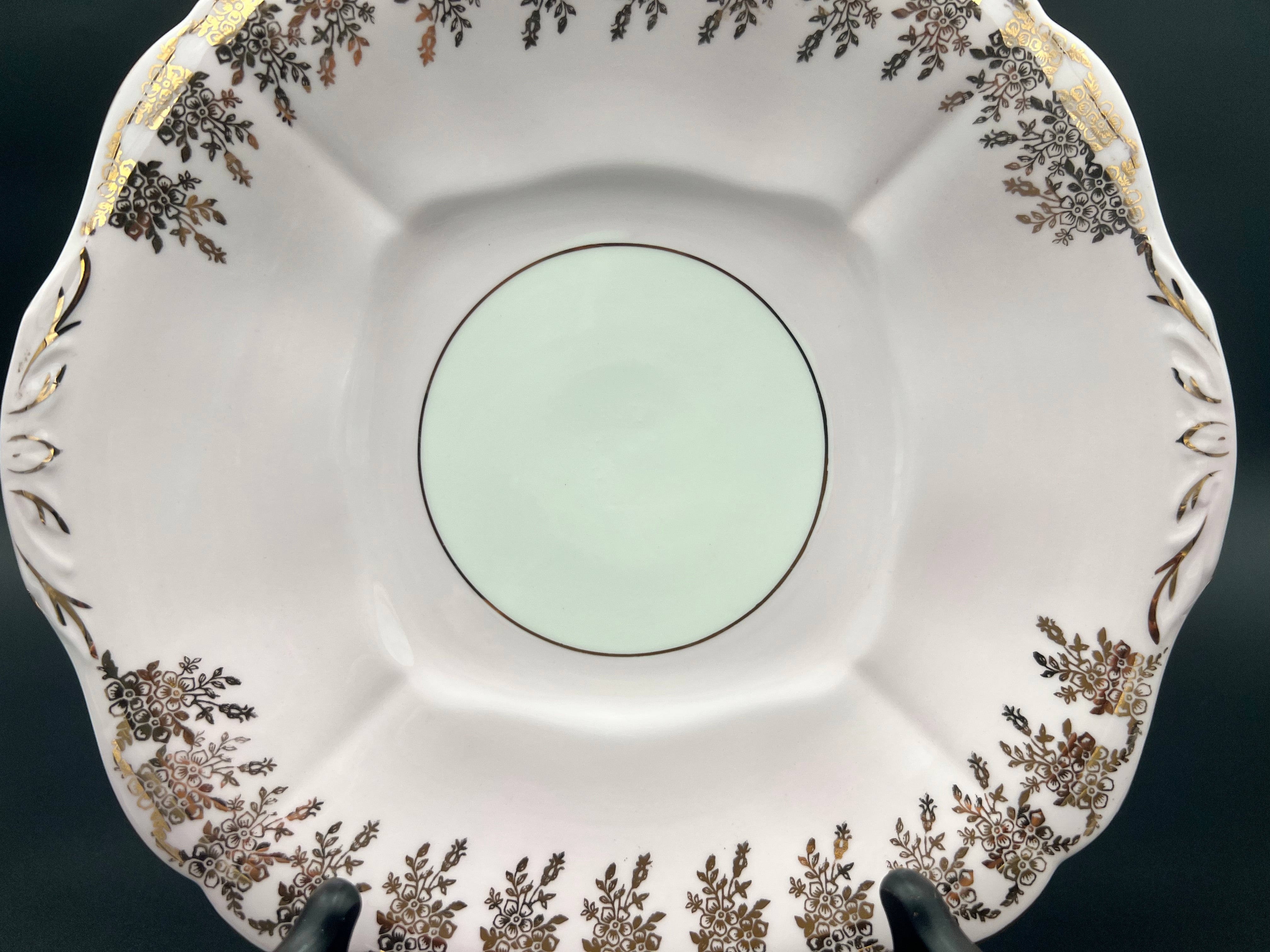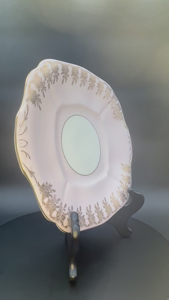 This exquisite Adderley plate is a piece of English artistry from the mid-20th century, crafted in fine bone china with the elegance that defined postwar design. The delicate blush-pink ground is adorned with intricate gilt floral sprays, their shimmer catching the light with refined subtlety. A scalloped rim lends graceful movement, while the gold trim frames the piece in quiet luxury.