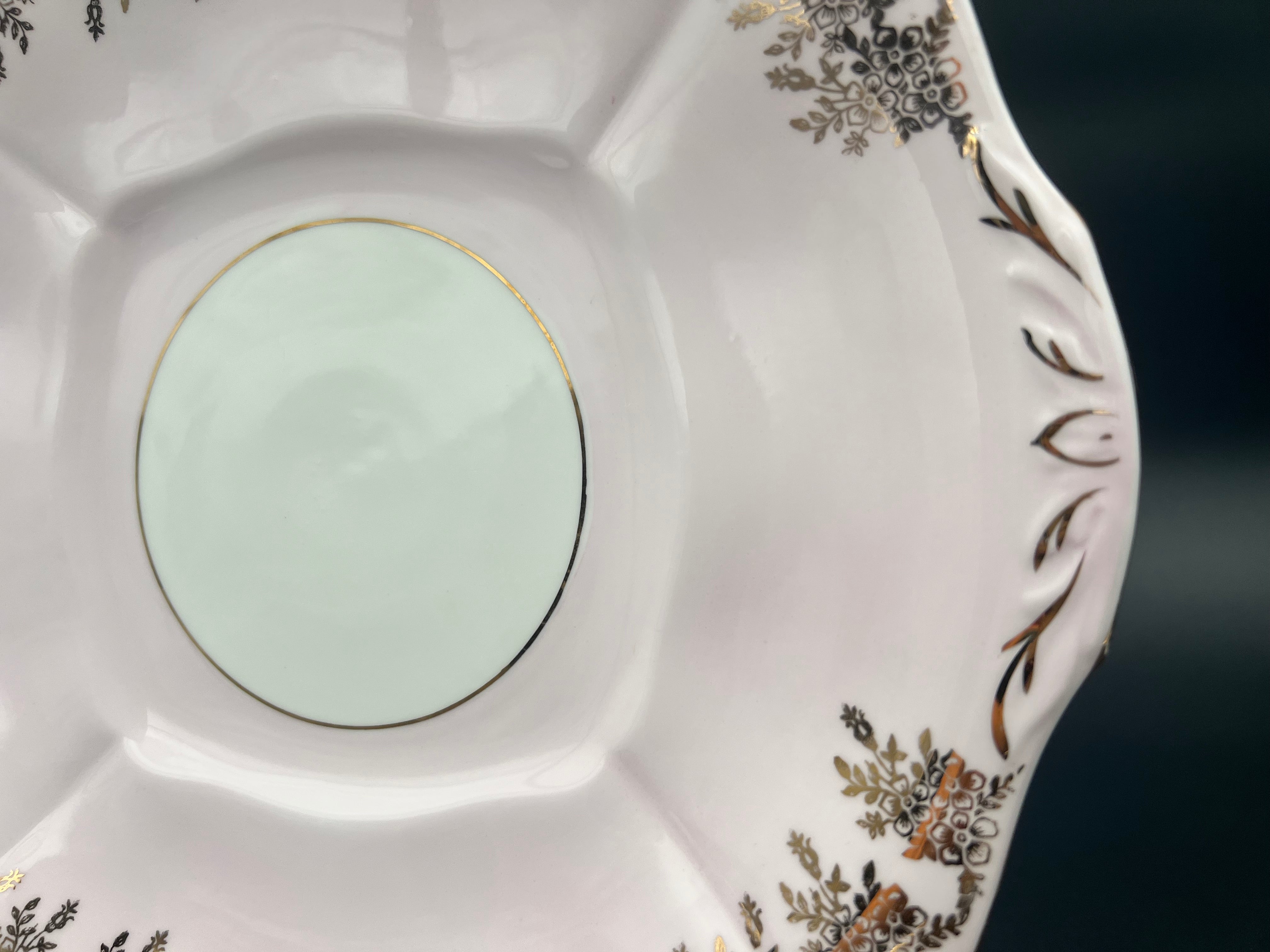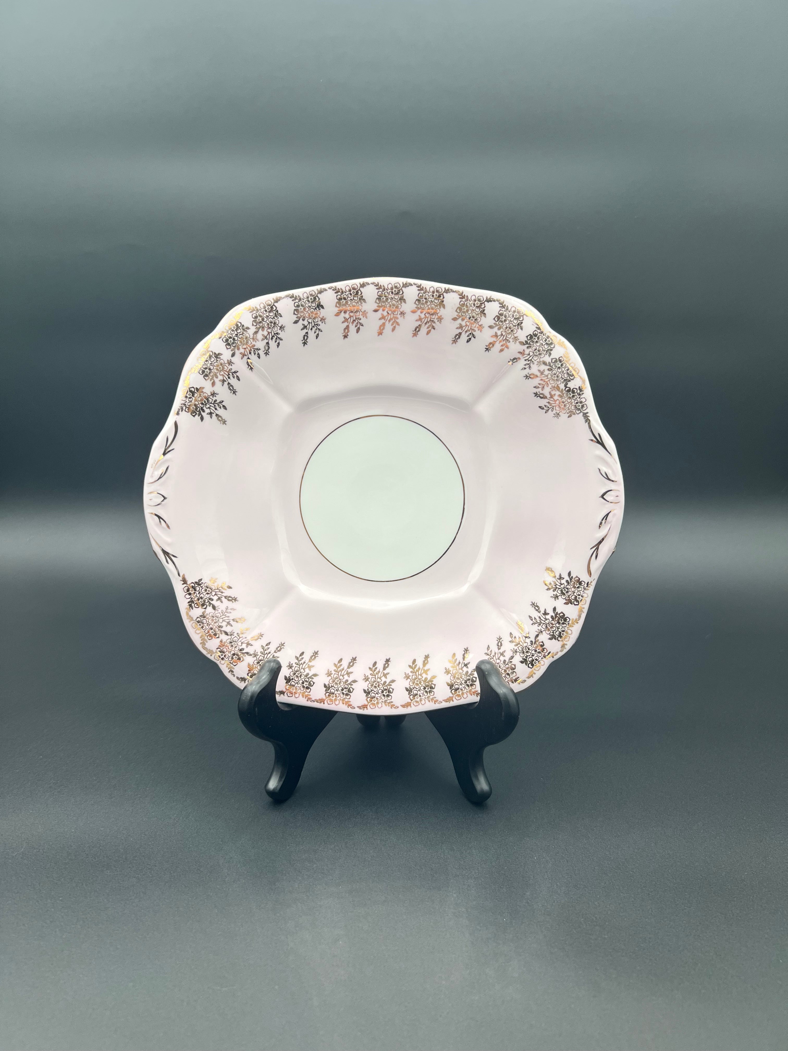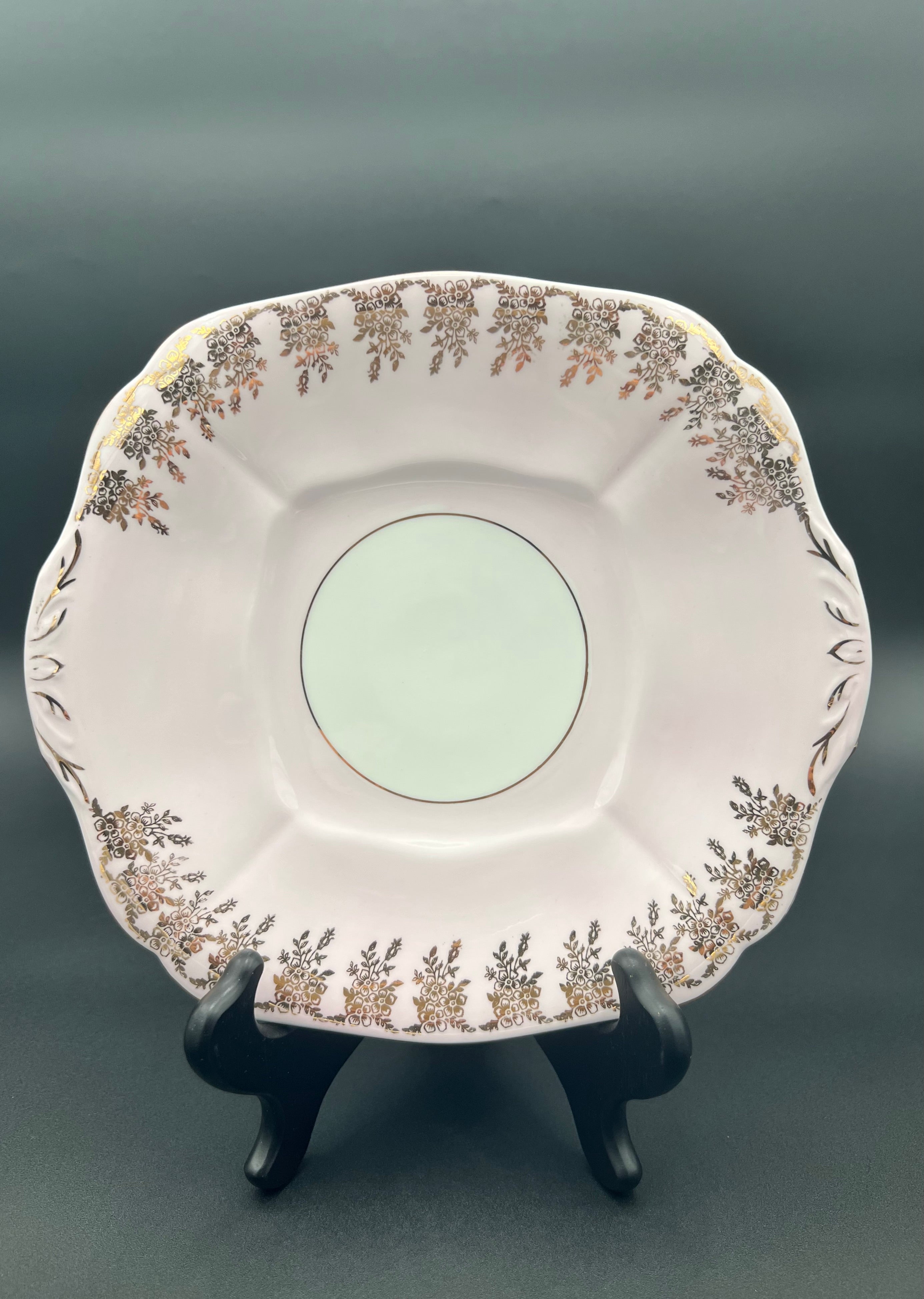 This exquisite Adderley plate is a piece of English artistry from the mid-20th century, crafted in fine bone china with the elegance that defined postwar design. The delicate blush-pink ground is adorned with intricate gilt floral sprays, their shimmer catching the light with refined subtlety. A scalloped rim lends graceful movement, while the gold trim frames the piece in quiet luxury.