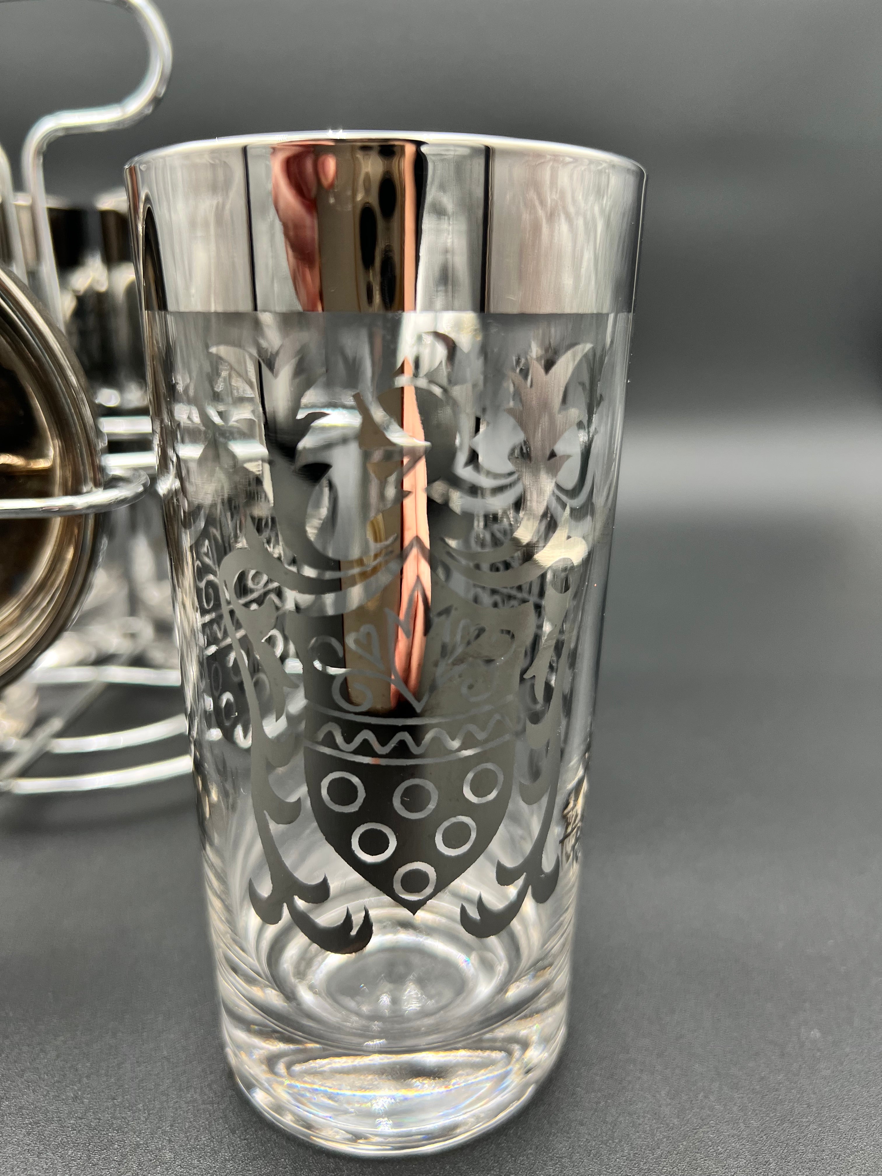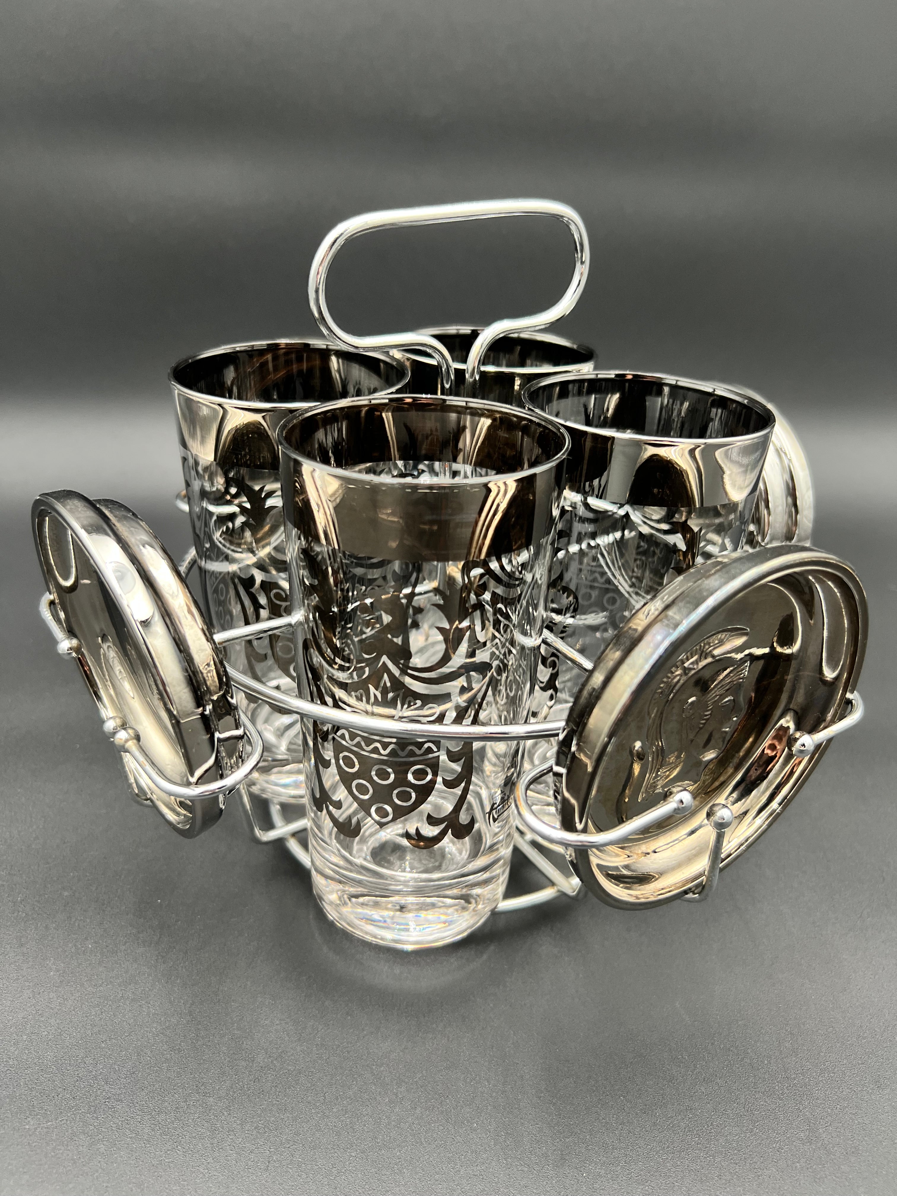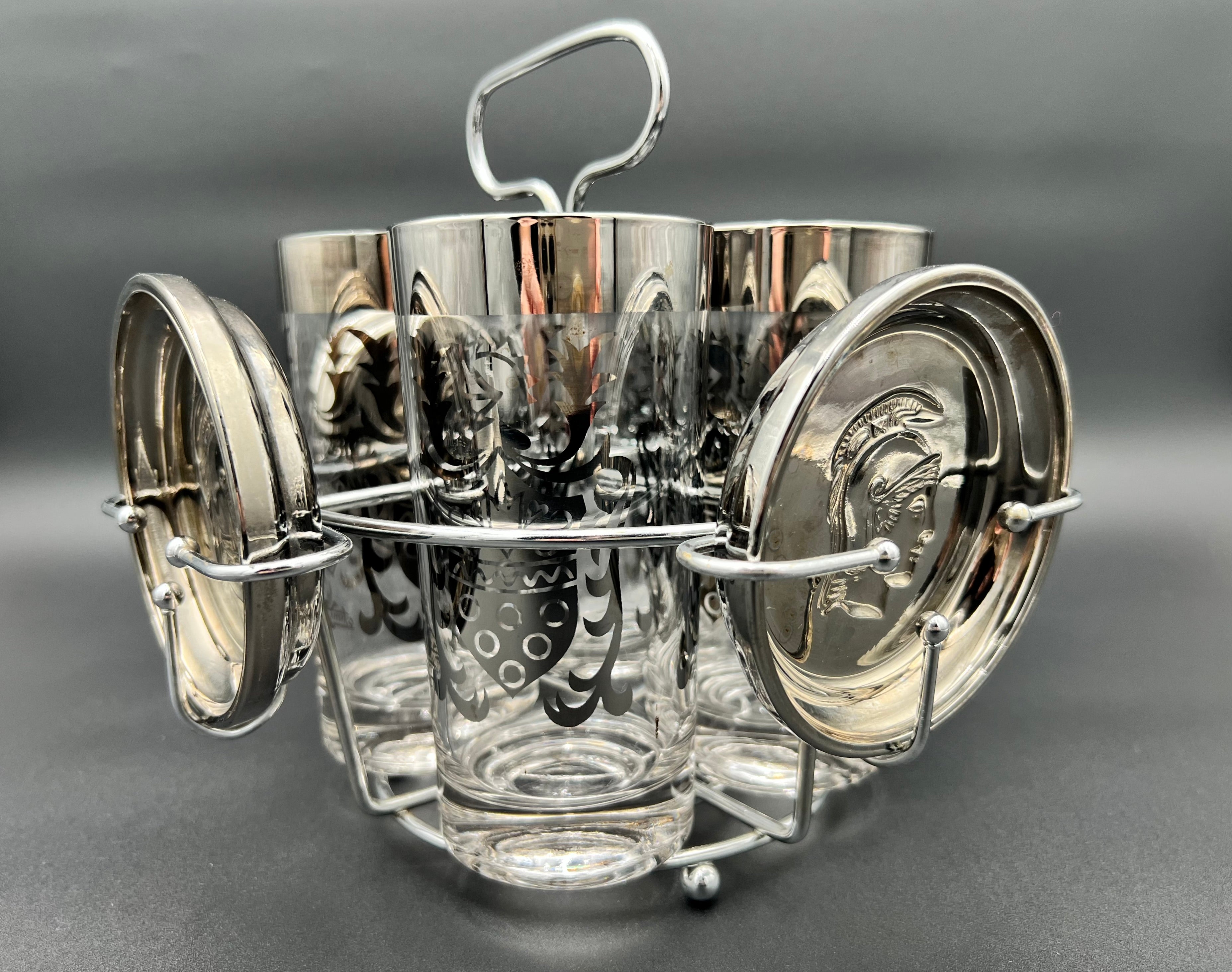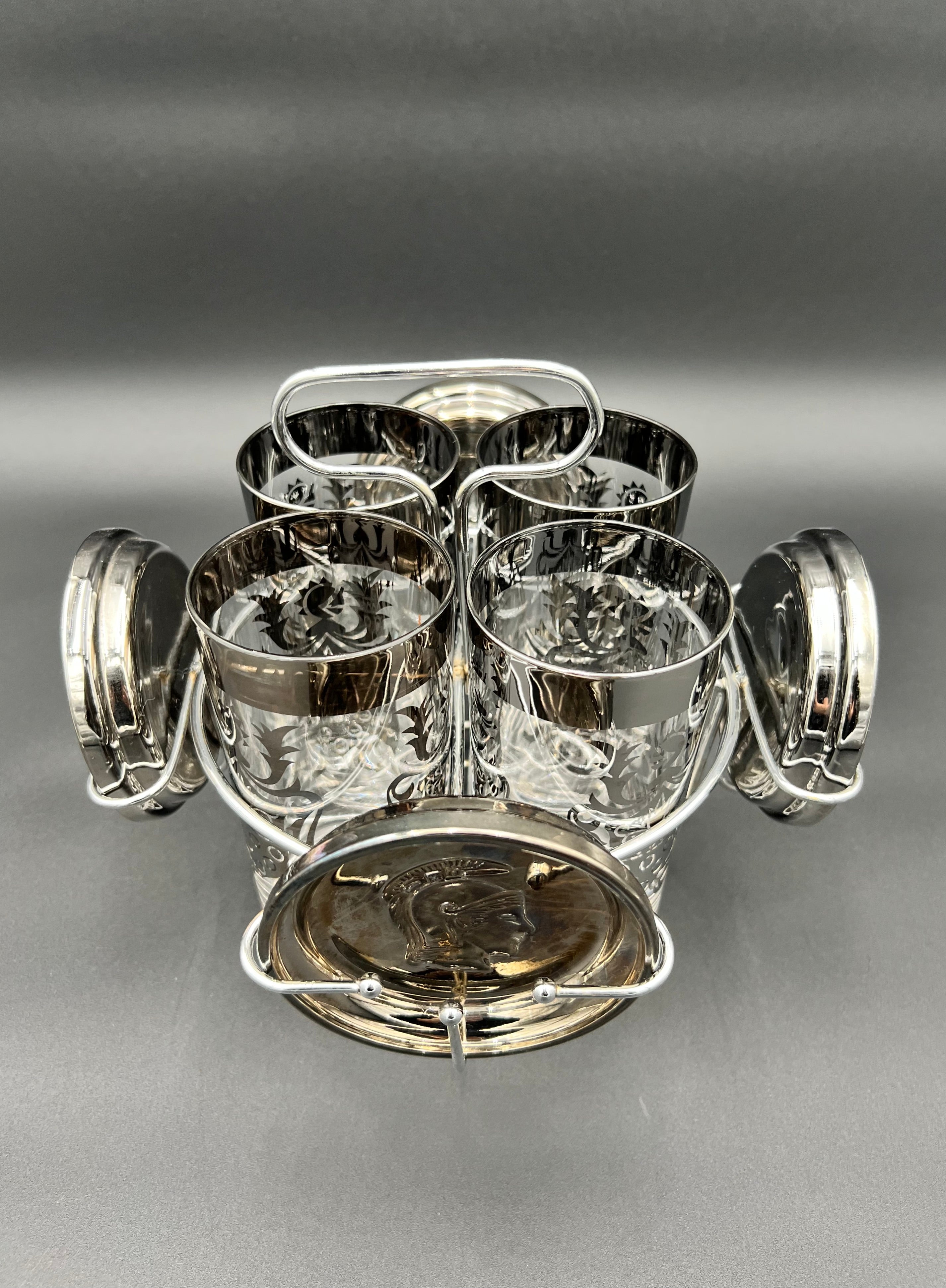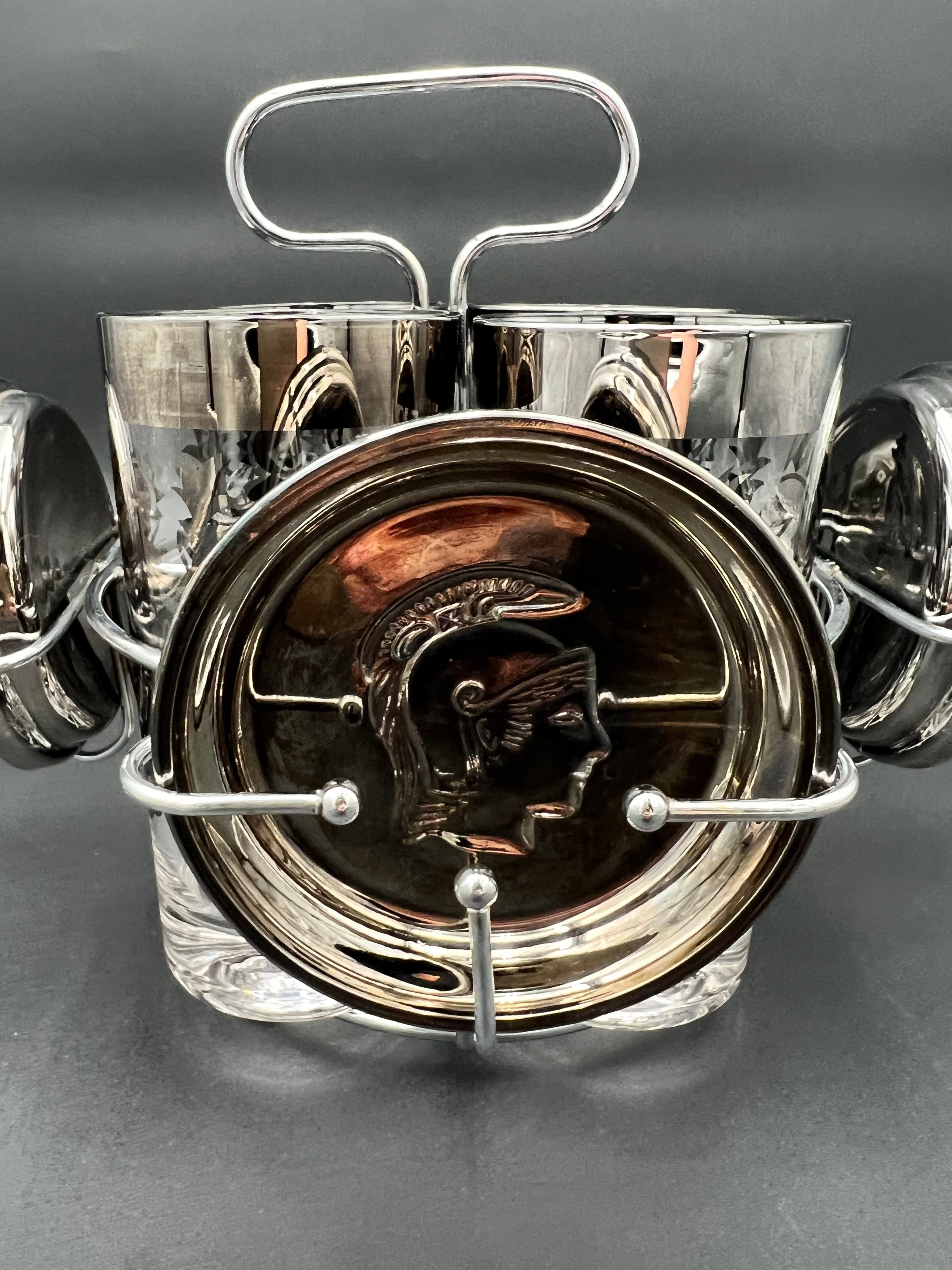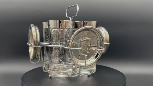 Each glass is decorated with intricate silver designs, while the coasters feature raised Roman Centurion (Guardian) crests, tying the theme together. Both the glasses and coasters rest neatly in the chrome caddy, which doubles as a display piece for bar carts and cocktail stations.