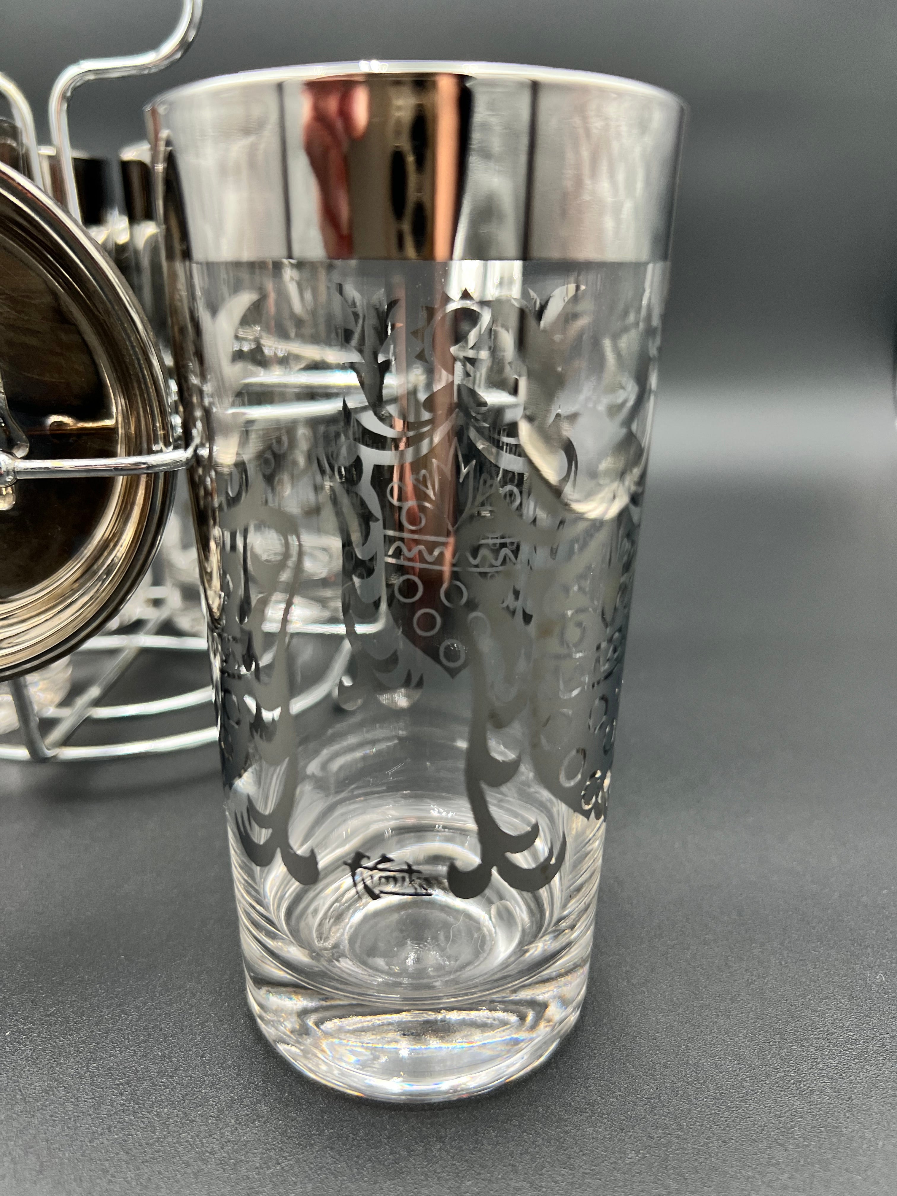This vintage Kimiko Guardian barware set from the 1960s brings mid-century style and sophistication to your home. Produced by Vitreon Queen’s Lusterware, the set includes four clear highball glasses with silver overlay accents, four matching glass coasters, and a chrome caddy for easy serving and storage.