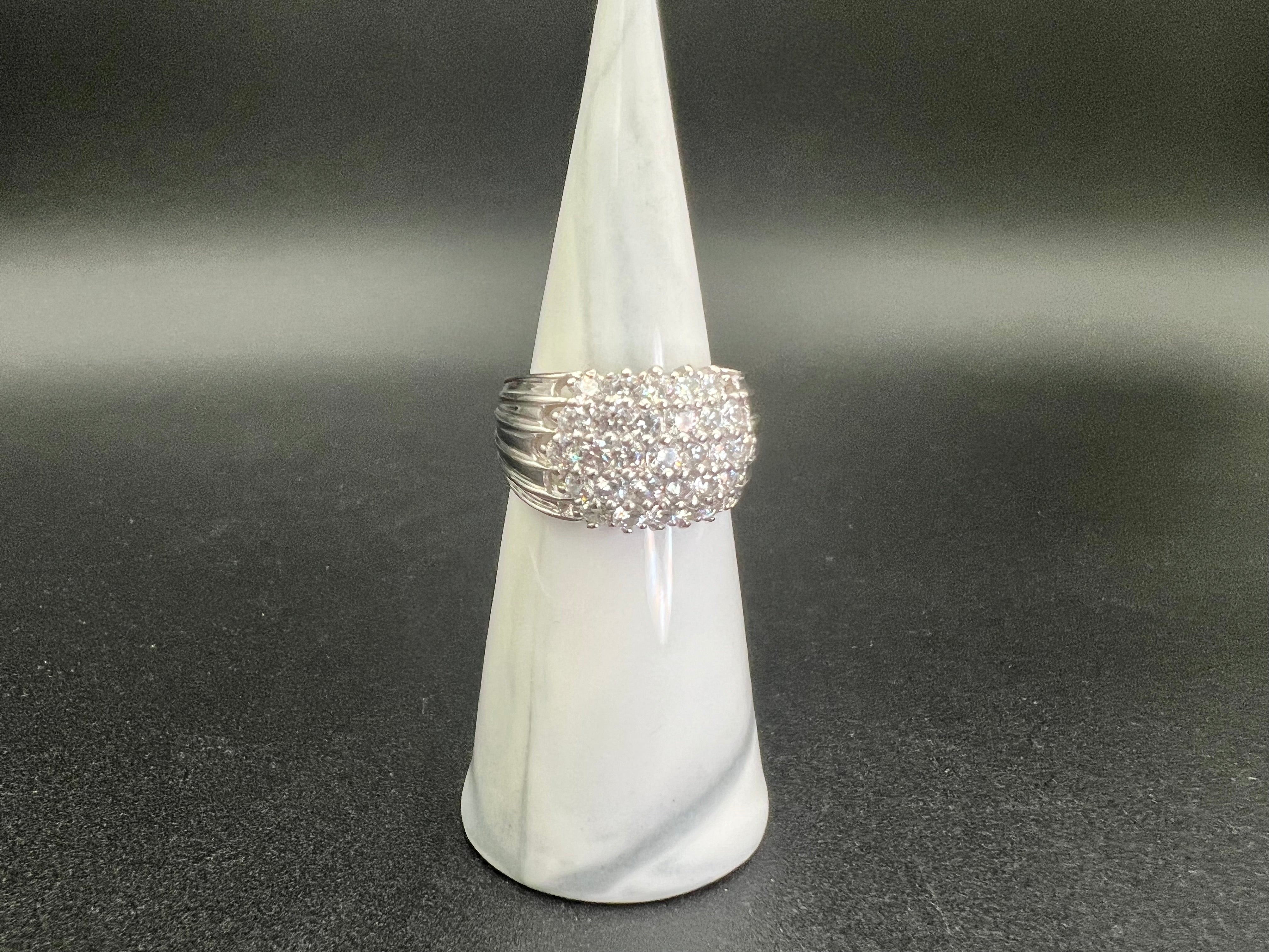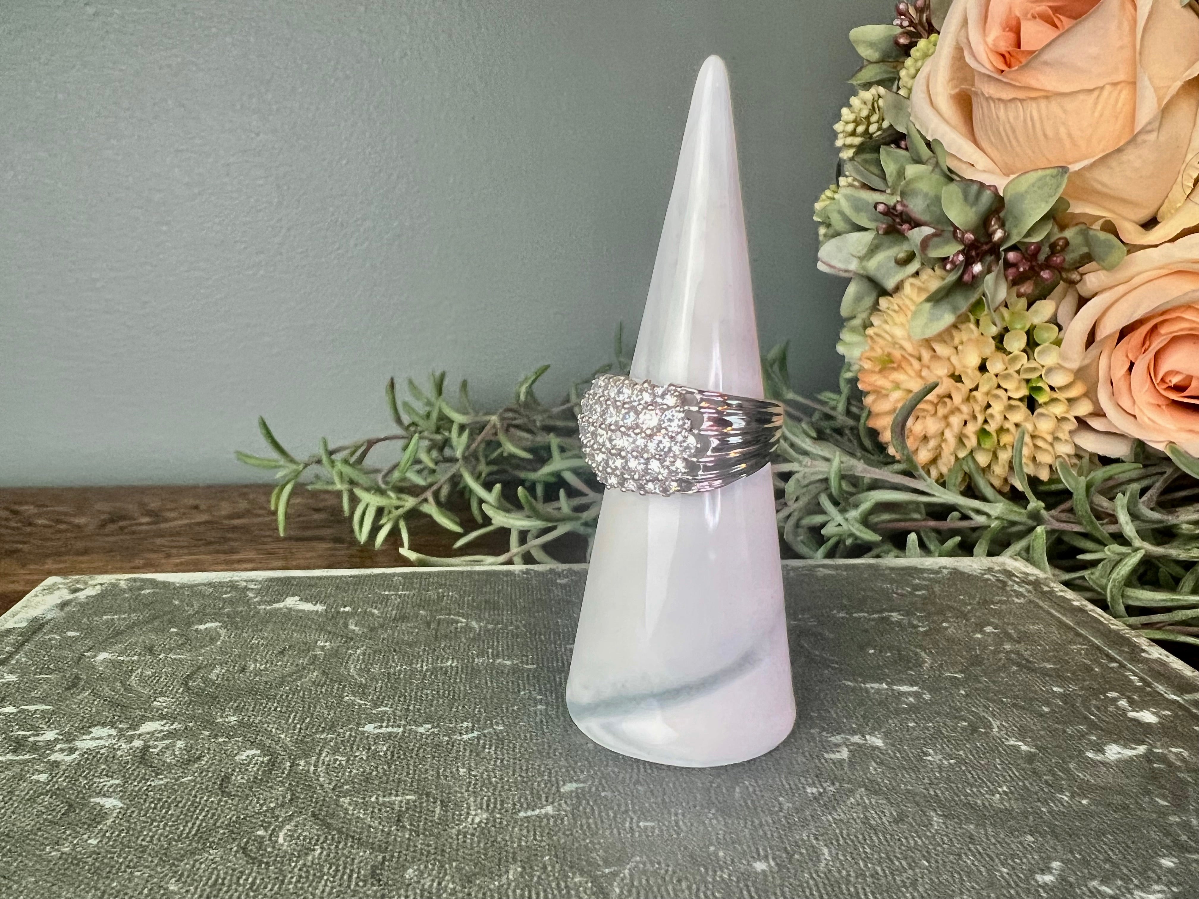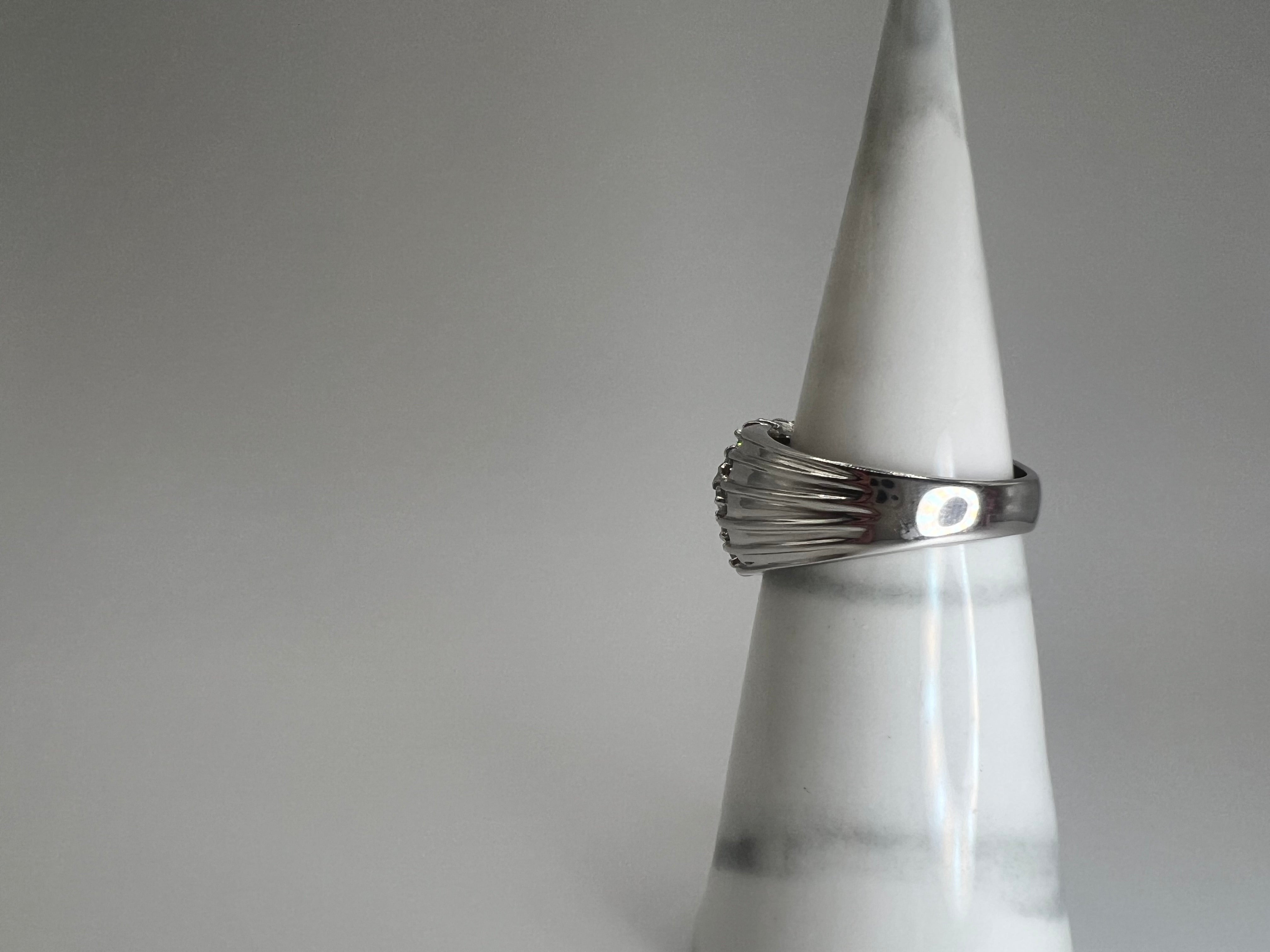 Five rows of light, caught and held in silver. Nineteen simulated diamonds arc across the band, their brilliance framed by ridged edges that curve and wrap with sculptural rhythm.