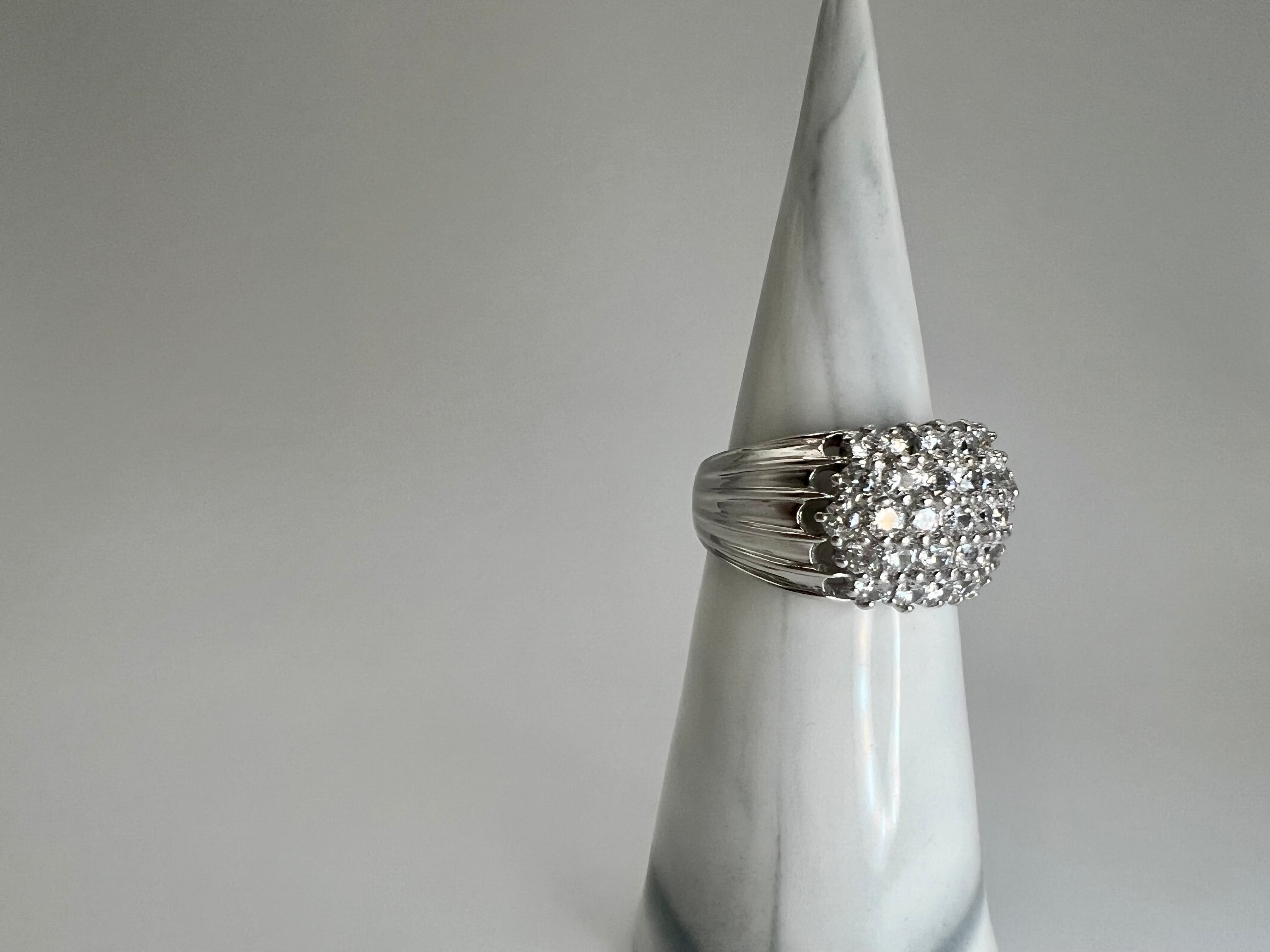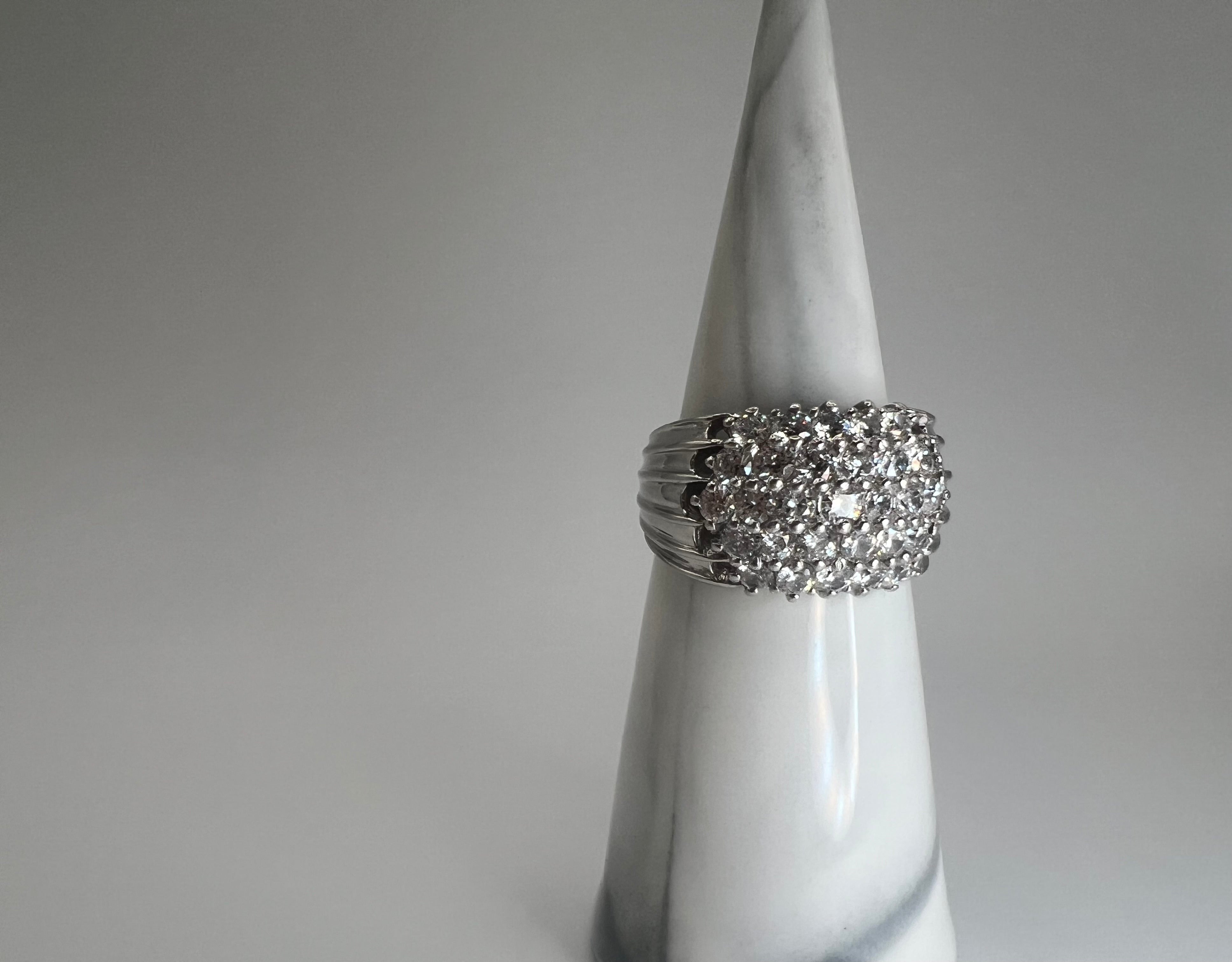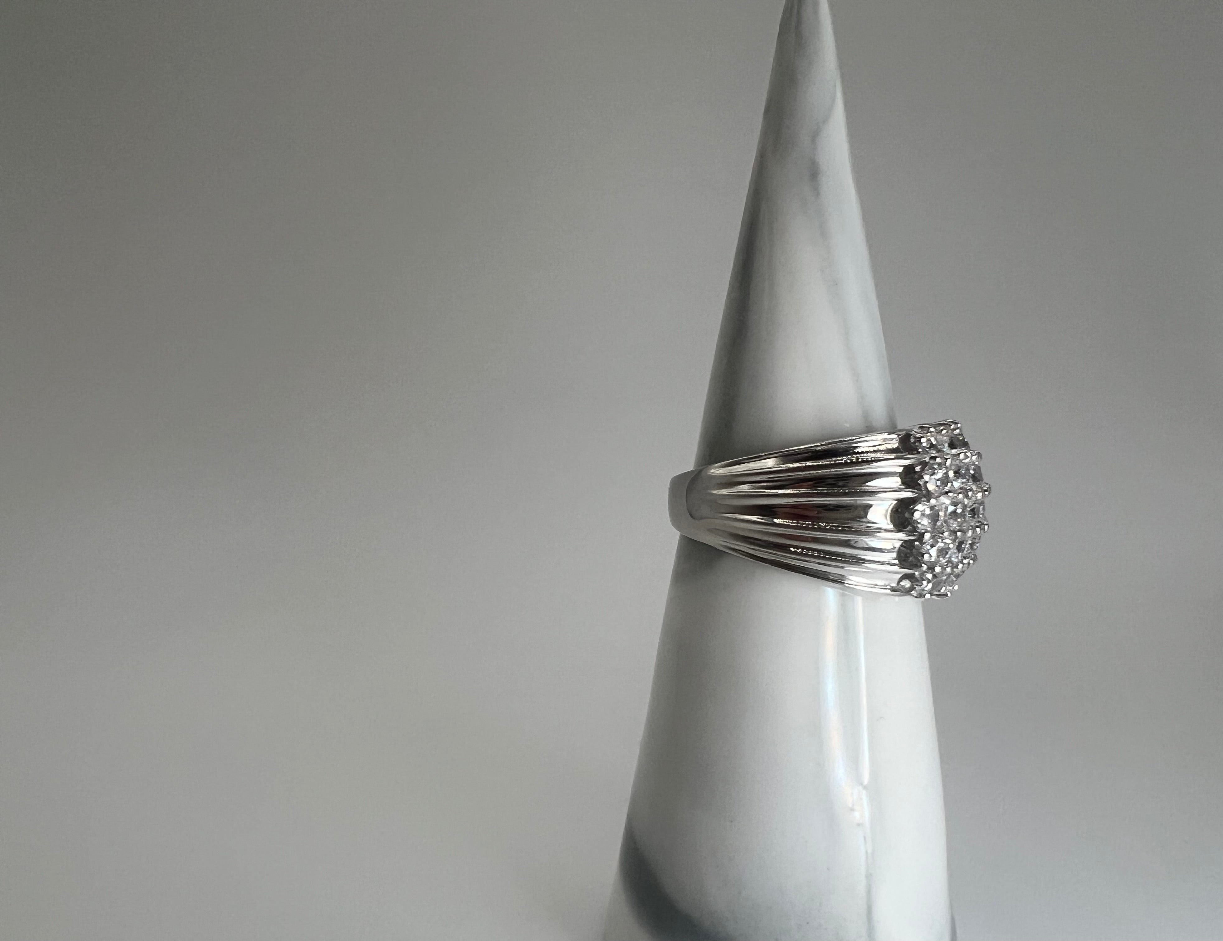 Five rows of light, caught and held in silver. Nineteen simulated diamonds arc across the band, their brilliance framed by ridged edges that curve and wrap with sculptural rhythm.